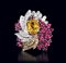 ANELLO. In oro bianco e rosa 18 kt montatura asimmetrica di gusto floreale centrata da quarzo citrino taglio ovale di cts. 2,40 ca. impreziosito da diamanti taglio baguette, carrè e brillante per tot. cts. 0,80 ca. entro bordure milligranate e rubini taglio rotondo per tot. cts. 2,30 ca.