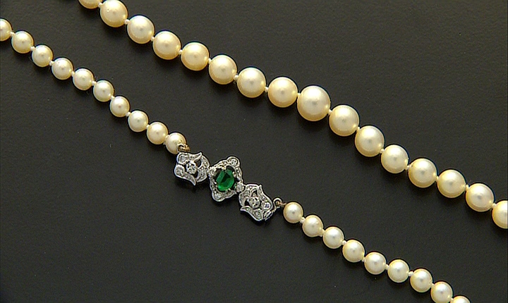 COLLANA. Ad un filo di perle coltivate Giappone disposte a degrader dal centro di mm 9/5 ca. con chiusura in oro bianco 18 kt decorata da smeraldo taglio rettangolare a contorno ottagonale di cts. 0,30 ca. (visibili mancanze di materiale) e diamanti taglio huit-huit per tot. cts. 0,25 ca.