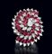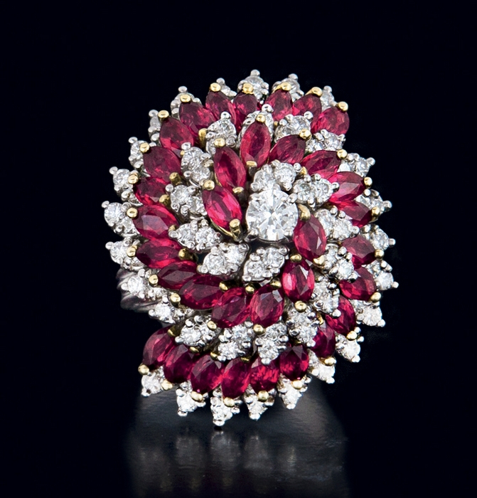ANELLO. In oro bianco e giallo bassa caratura sommità realizzata a fili lisci con grande motivo a spirale centrato alla sommità da diamante taglio brillante di cts. 0,25 ca. entro decori in diamanti taglio brillante per tot. cts. 1,70 ca. e rubini taglio navette per tot. cts. 3,40 ca.