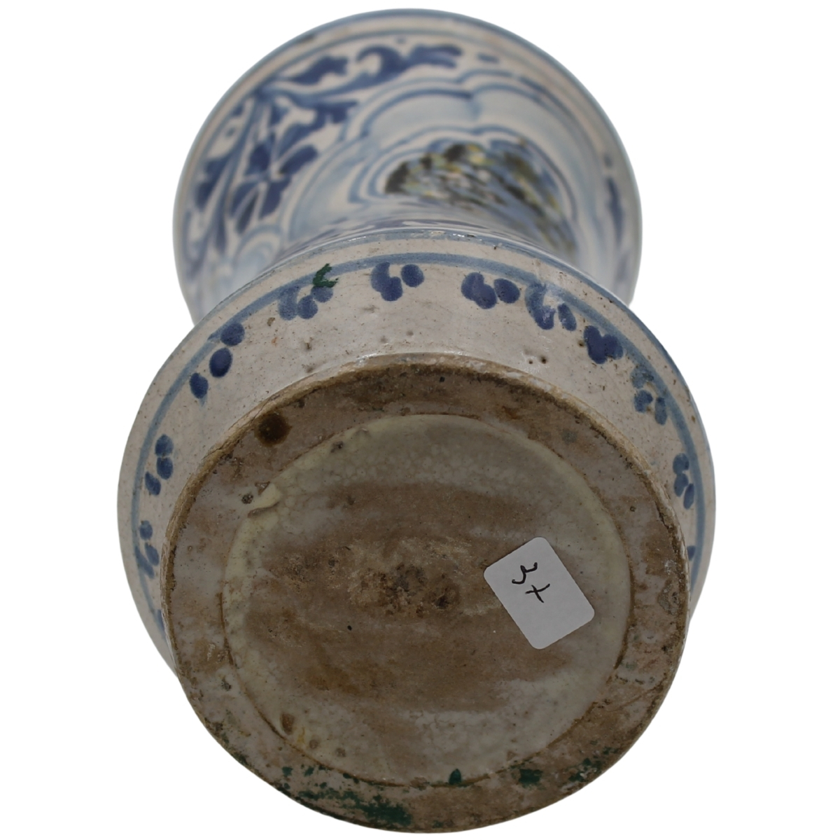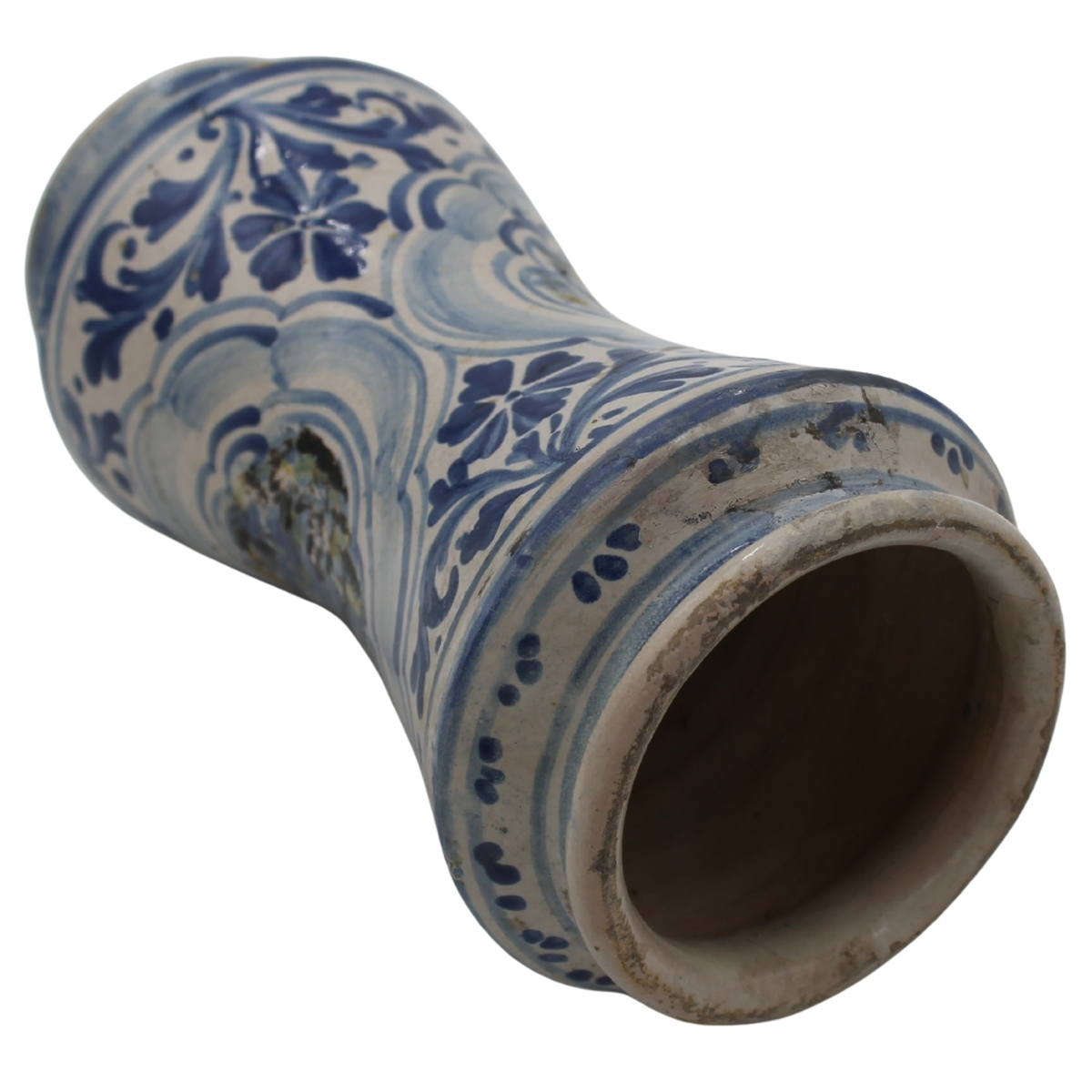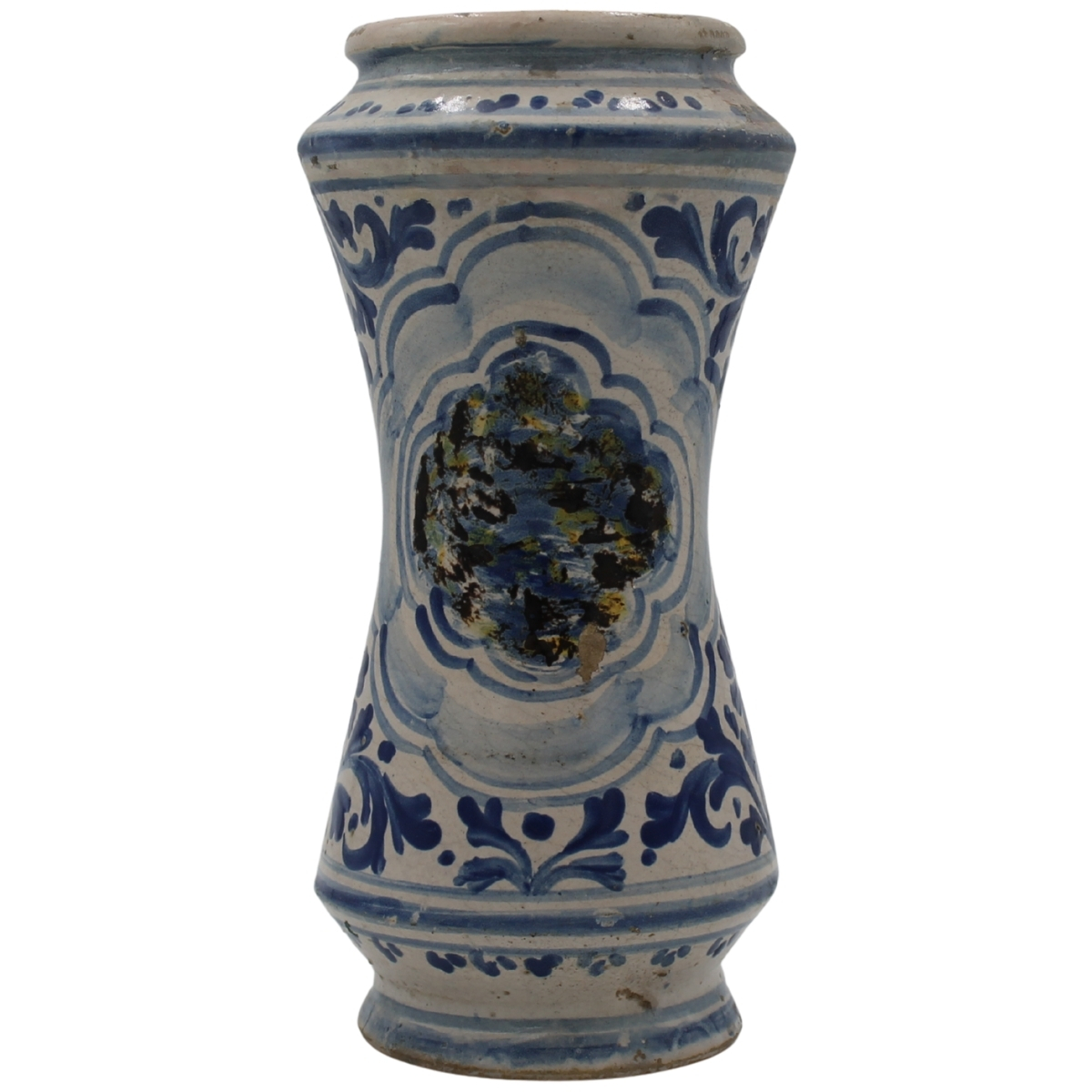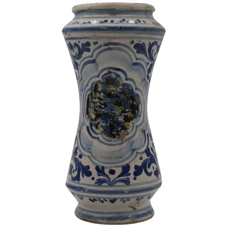 Albarello Antica maiolica con decoro a tutto tondo a motivi vegetali policromi. Caltagirone. Fine secolo XVIII. Cm 26,5
