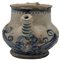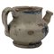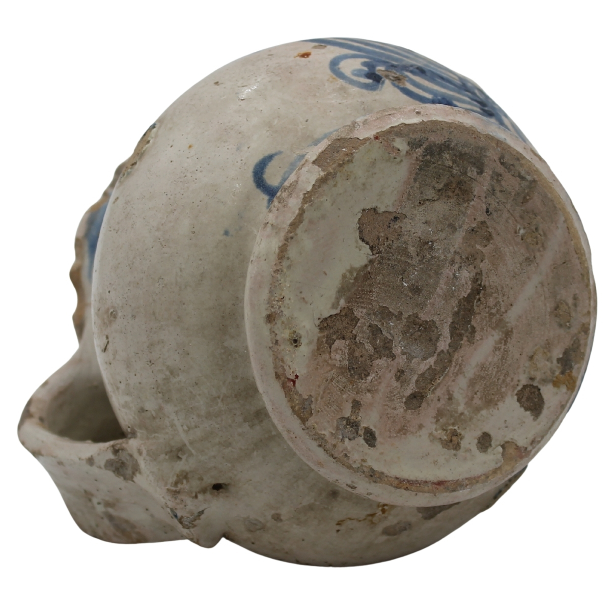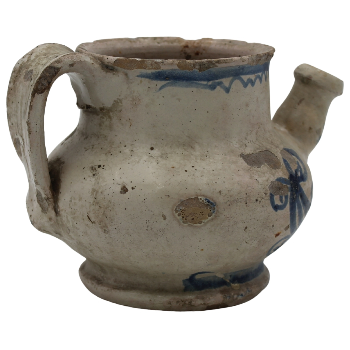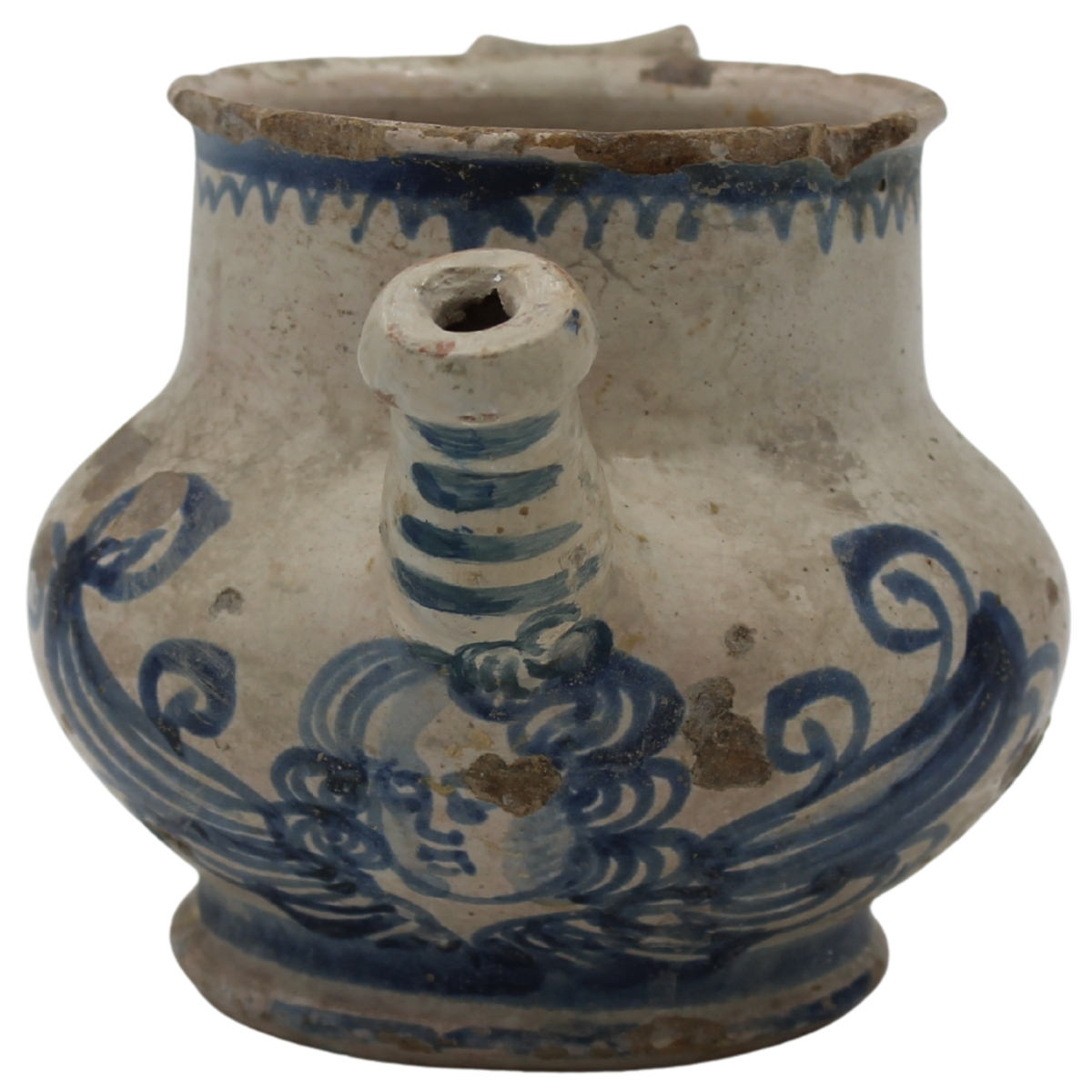 Versatoio Antica maiolica con decoro frontale raffigurante putto in azzurro su fondo crema. Caltagirone. Secolo XVIII. Cm h 12