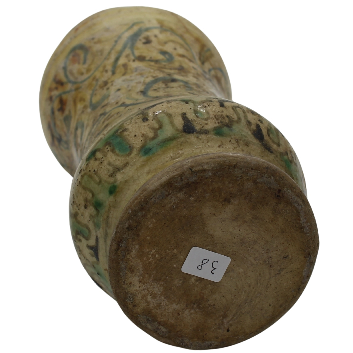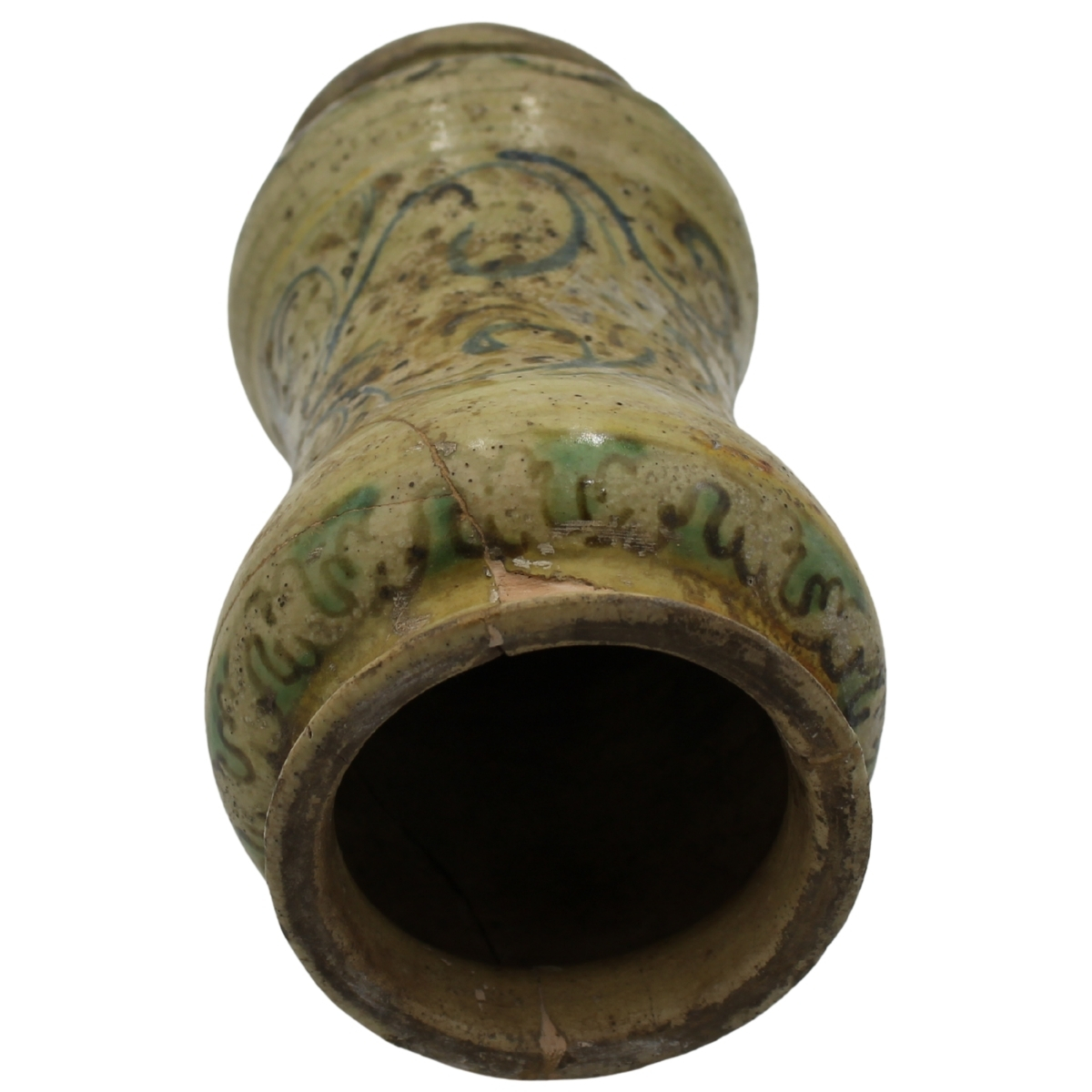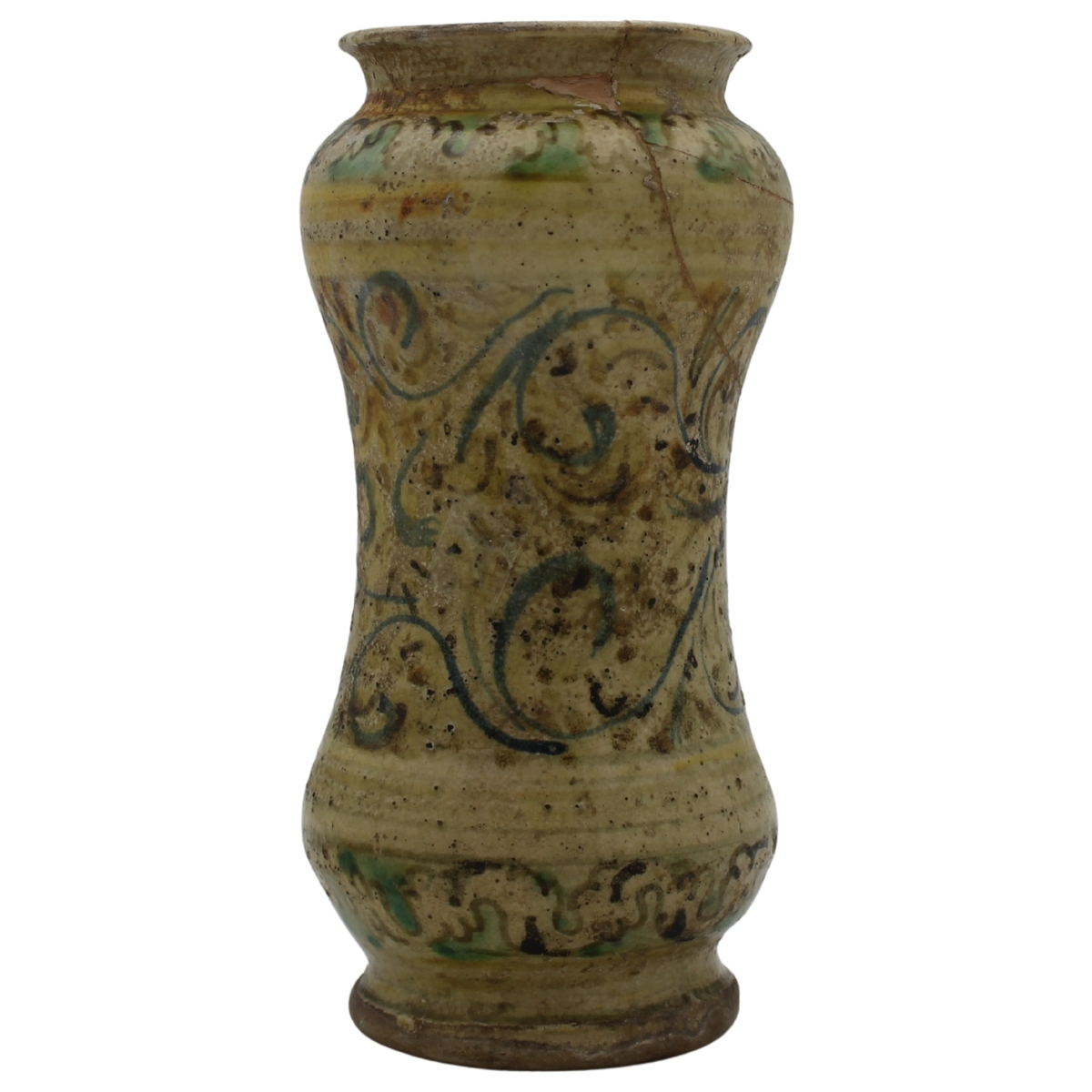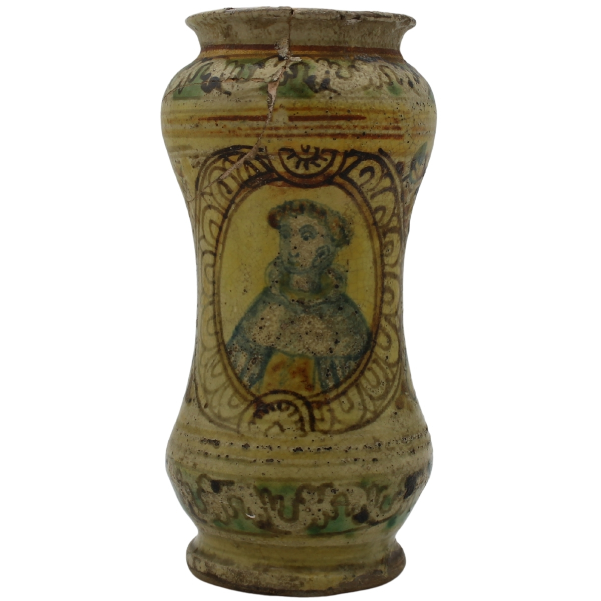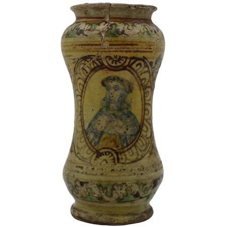 Albarello Antica maiolica con decoro frontale a medaglione con figura di santo e sul retro motivi ornamentali policromi (rotture al collo e restauri). Burgio. Secolo XVIII. Cm h 25