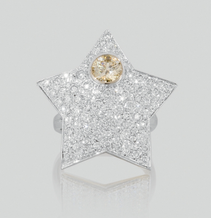 ANELLO. In oro bianco 18 kt internamente foderato, montatura a stella con profilo milligranato decorata da diamante fancy light yellow taglio brillante di cts. 0,72 (purezza VS2) entro contorno in diamanti taglio brillante per tot. cts. 1,50 ca. disposti a pavè, il diamante è accompagnato da certificato n. 228818 Centro Analisi Gemmologiche, Dott. Pio Visconti, Valenza.