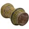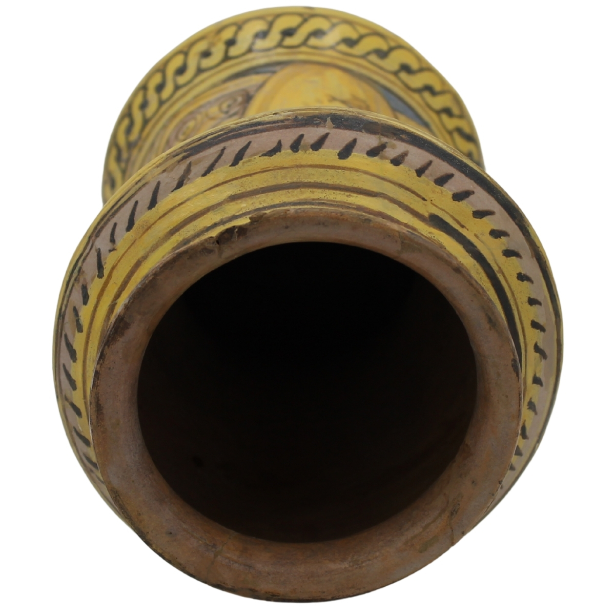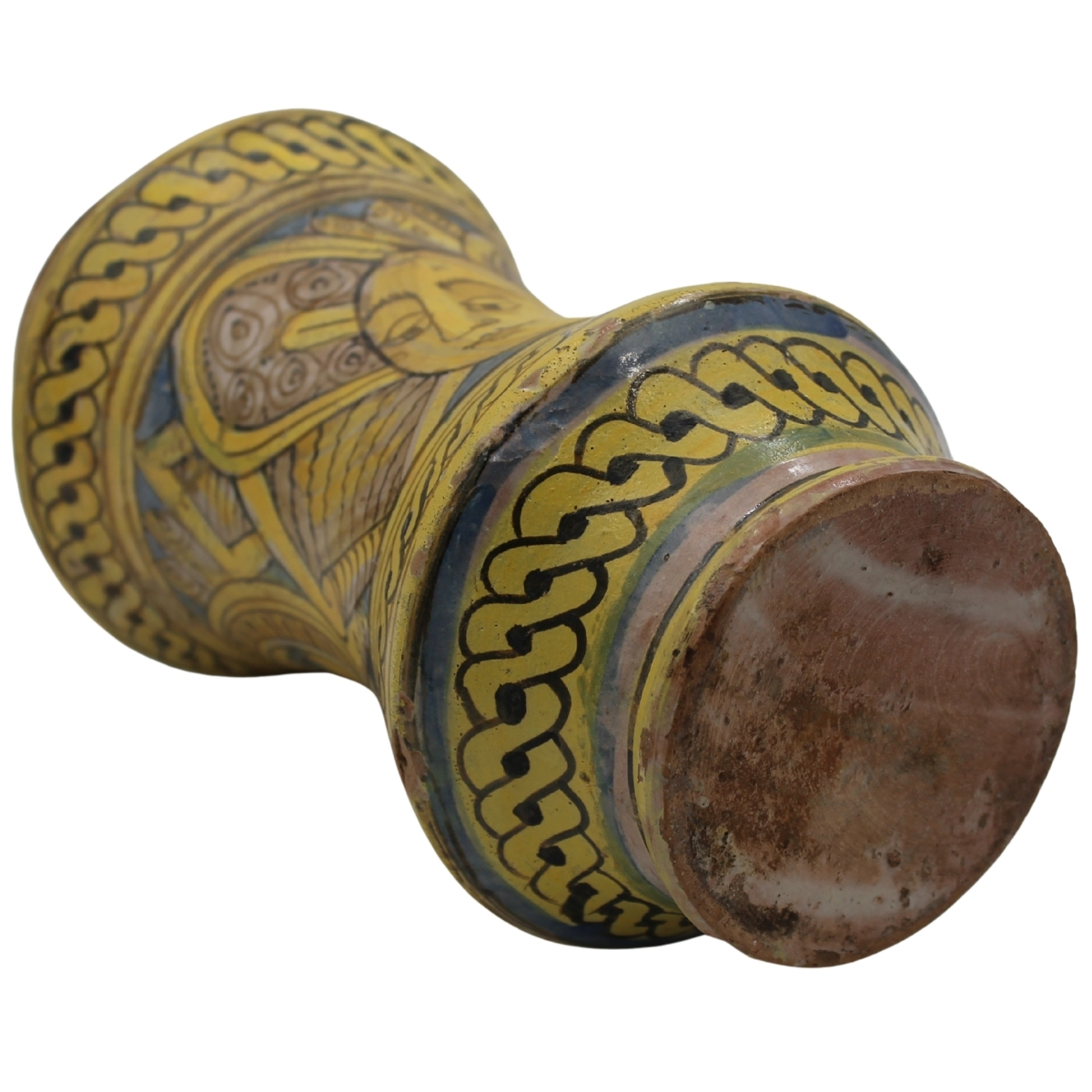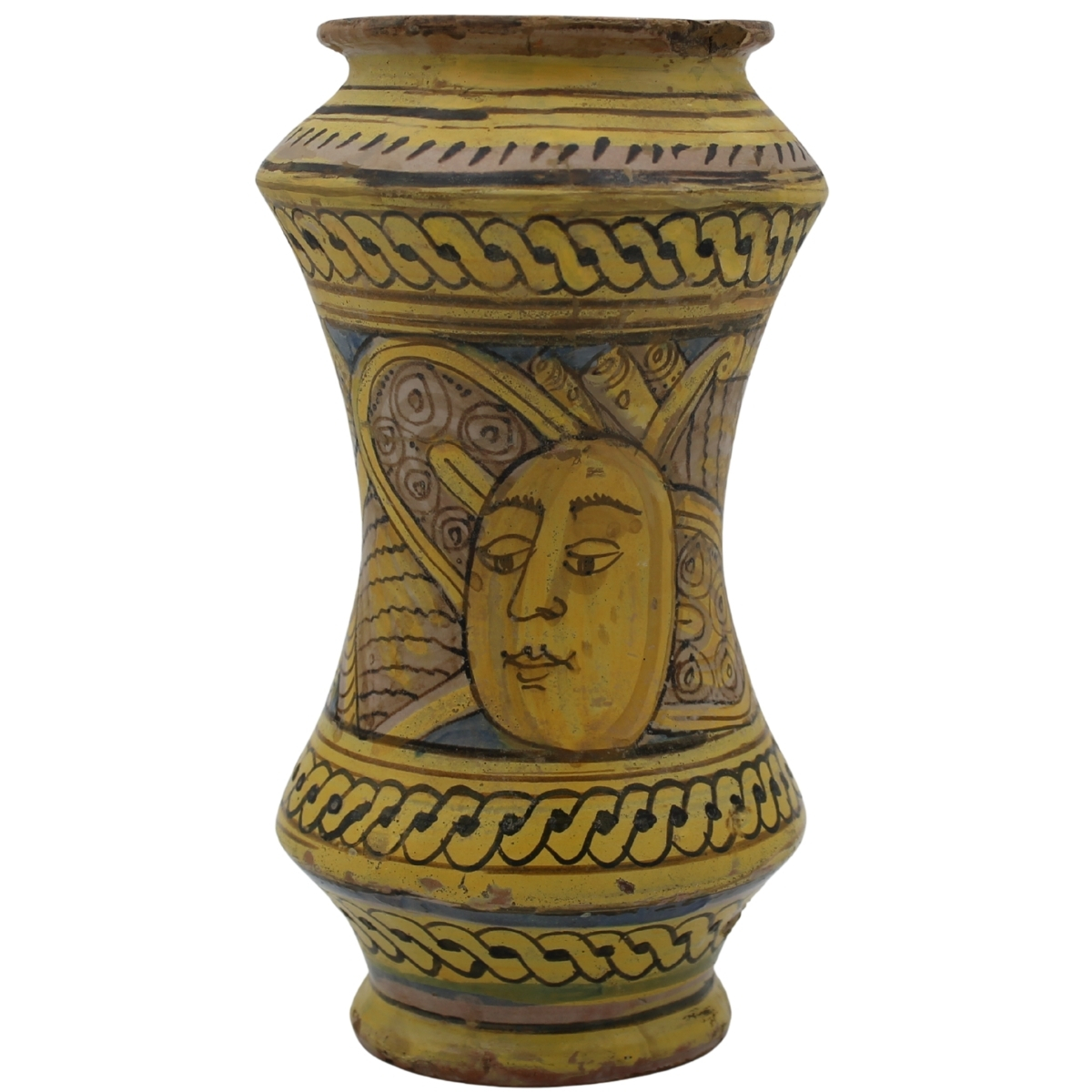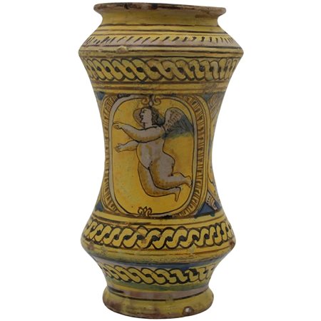 Albarello Antica maiolica con decoro frontale di medaglione centrale raffigurante putto alato e sul retro decoro a trofei e mascheroni (lievi piccoli restauri). Burgio. Secolo XVIII. Cm h 27