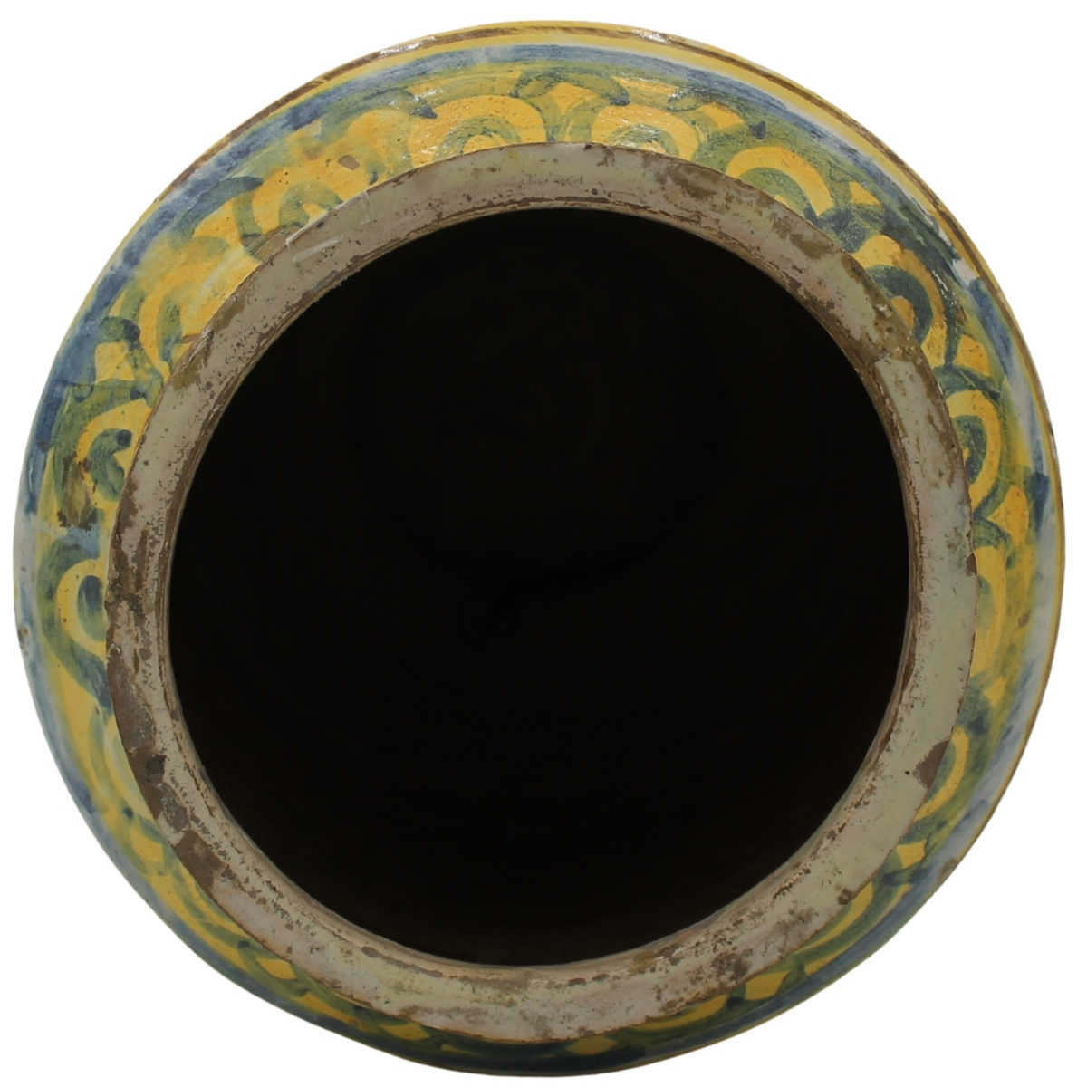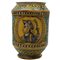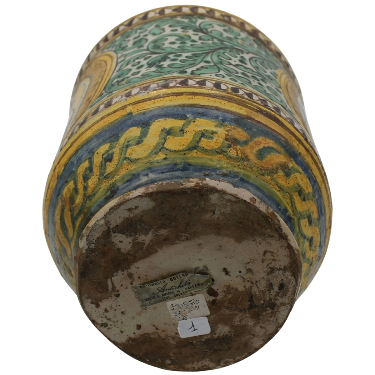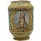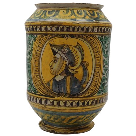 Grande cilindro Antica maiolica con decoro a doppio medaglione raffiguranti profilo di soldato e ritratto di vescovo, decoro a tutto tondo a motivi vegetali policromi (lievi rastui al collo e alla base). Burgio. Inizi del secolo XVIII. Cm h 33