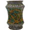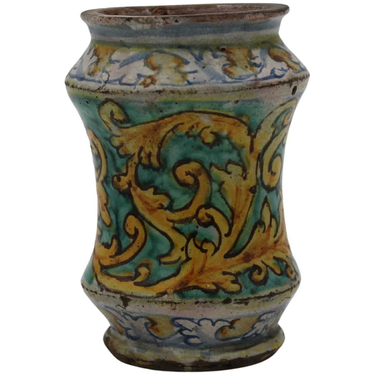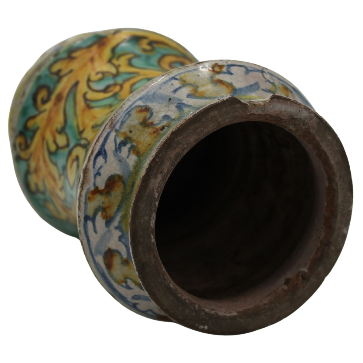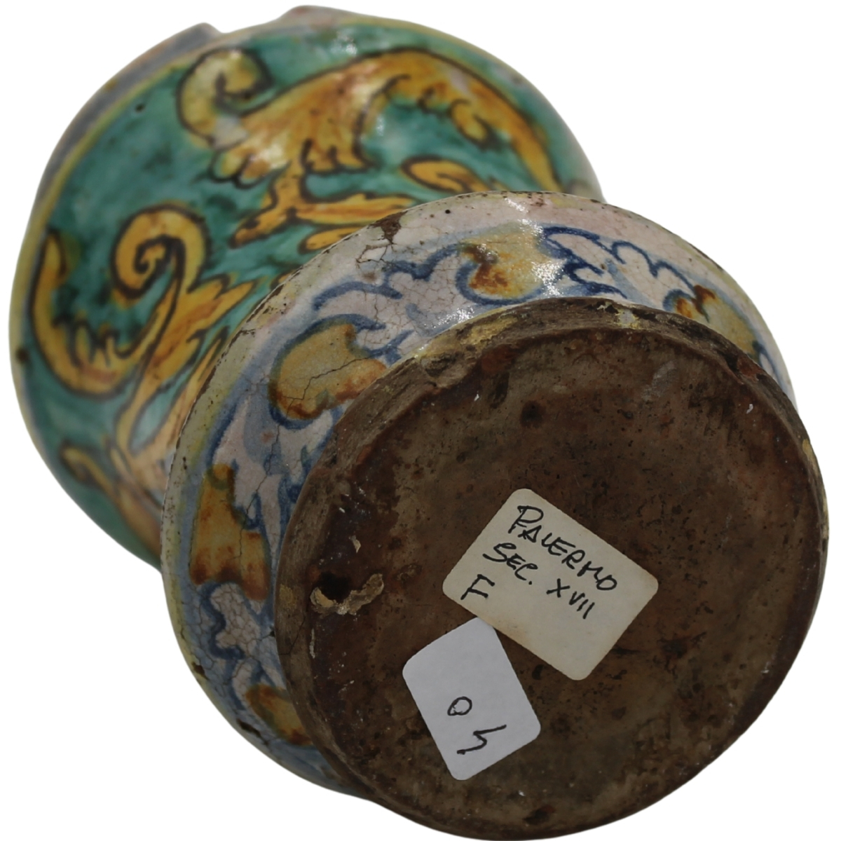 Piccolo albarello Antica maiolica coin decoro a tutto tondo a motivi vegetali policromi. Possibile Palermo. Secolo XVIII. Cm h 15