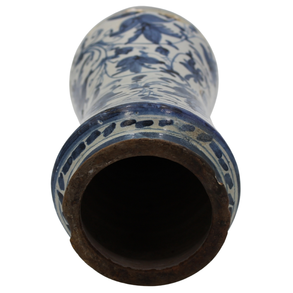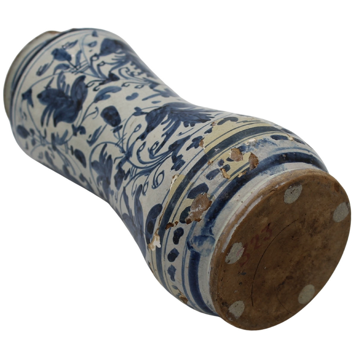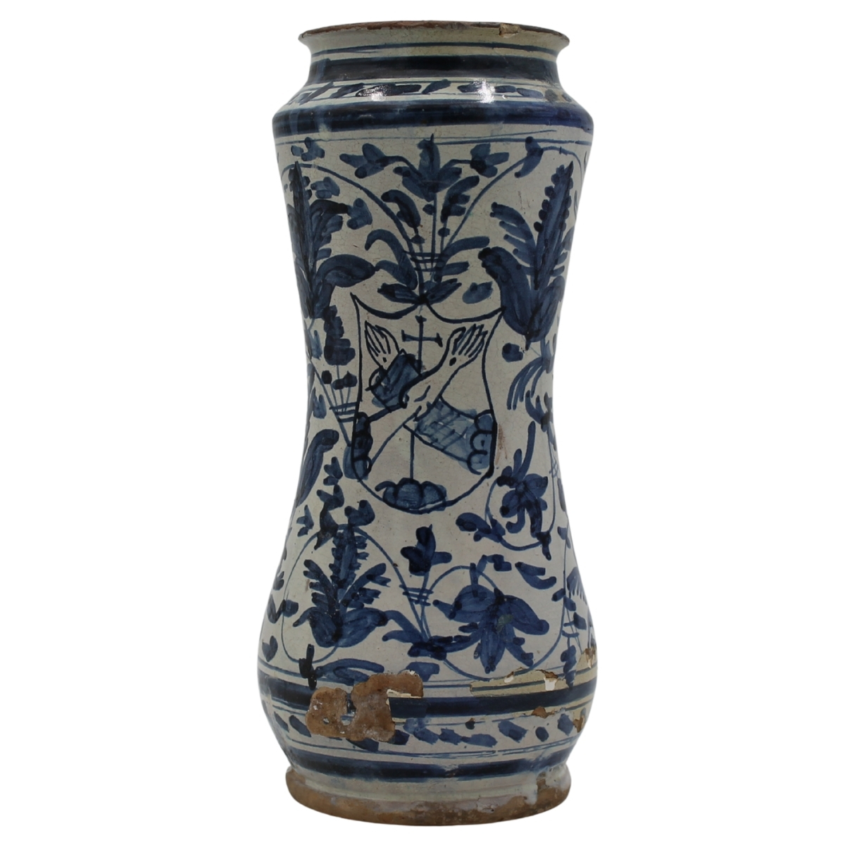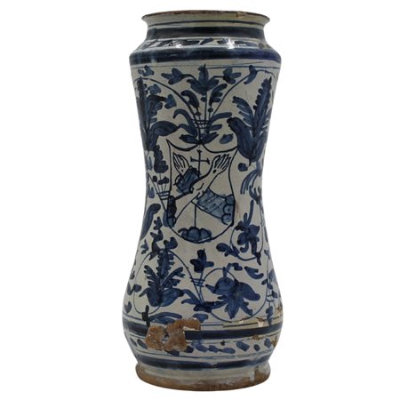 Albarello Antica maiolica con stemma gentilizio sul fronte e ricco decoro a motivi vegetali in azzurro su fondo bianco (evidenti restauri sul fondo e mancanze di smalto). Trapani. Secolo XVII. Cm h 28