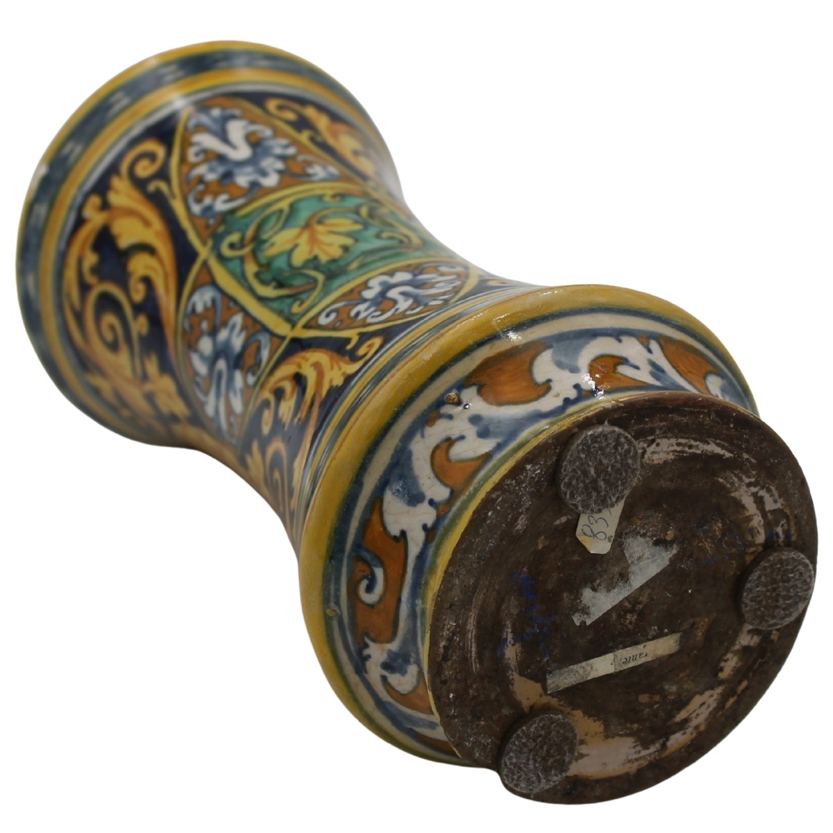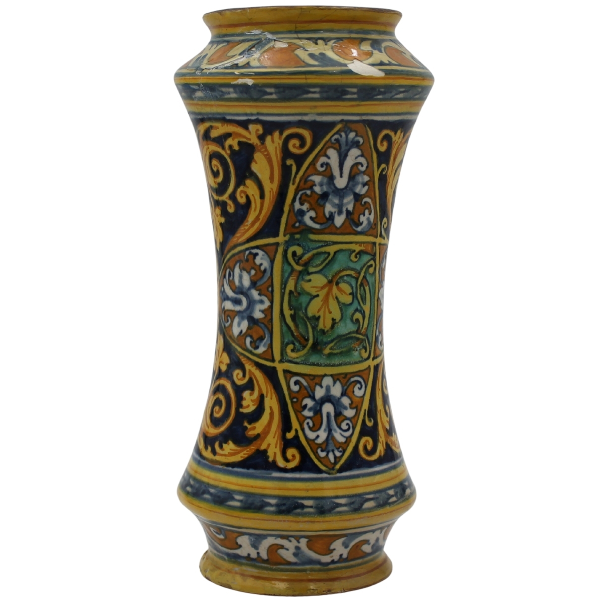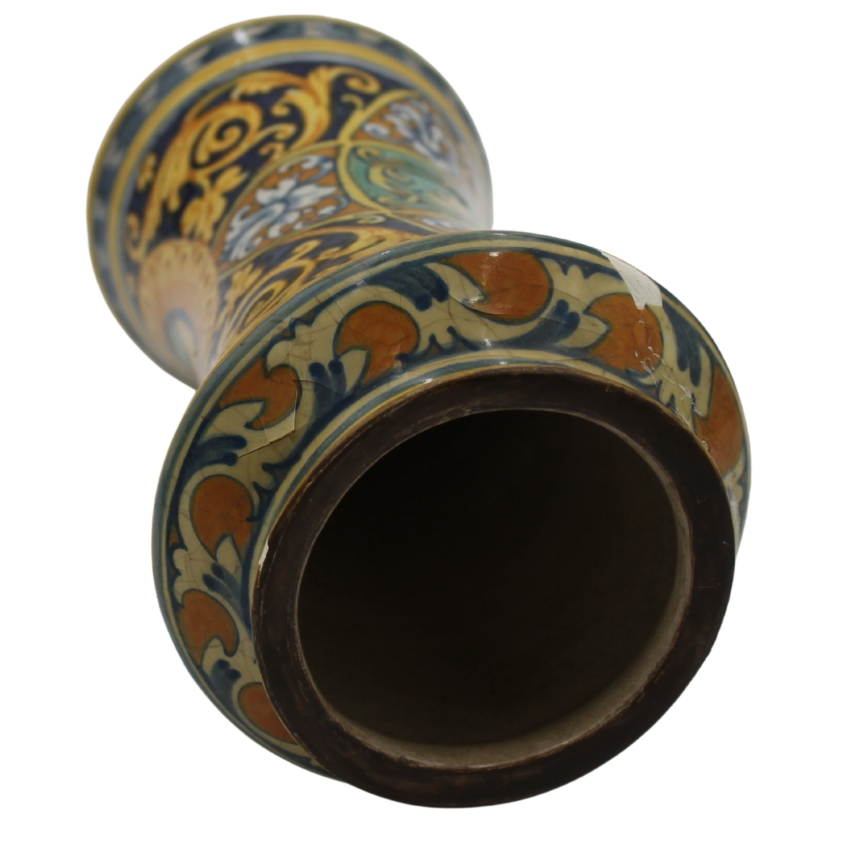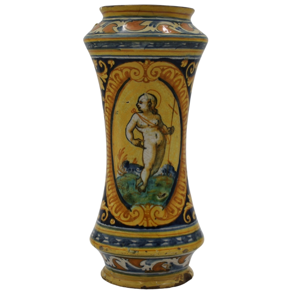 Albarello Antica maiolica con medaglione centrale raffigurante San Giovannino e sul retro decoro a motivi floreali e vegetali policromi (restauri e rifacimento del collo). Palermo. Secolo XVII. Cm h 29,5