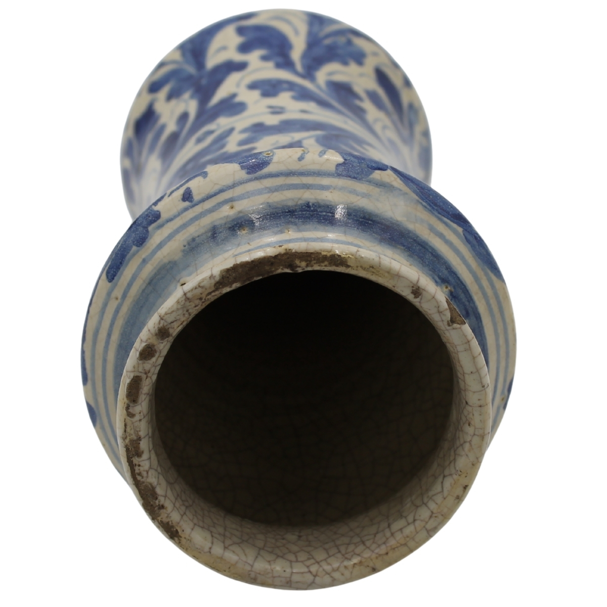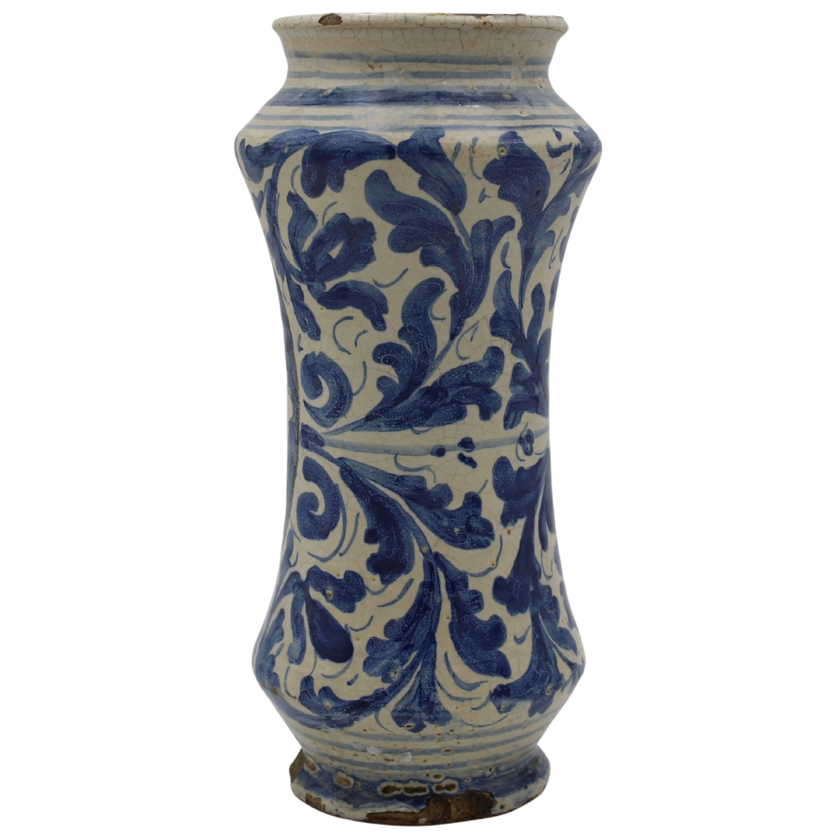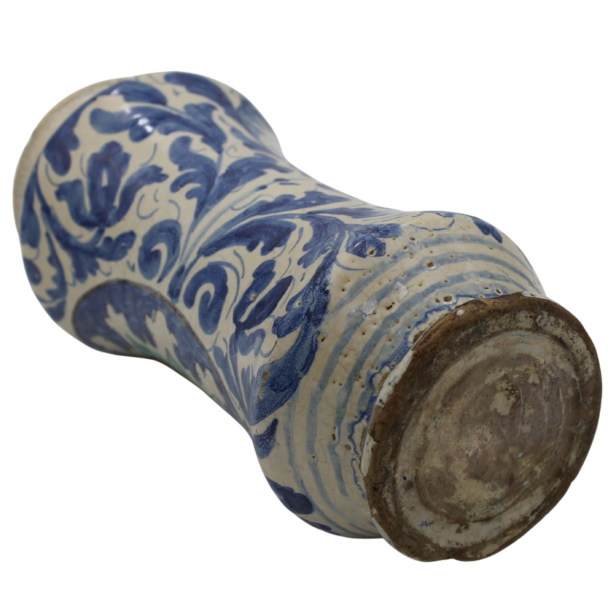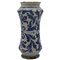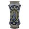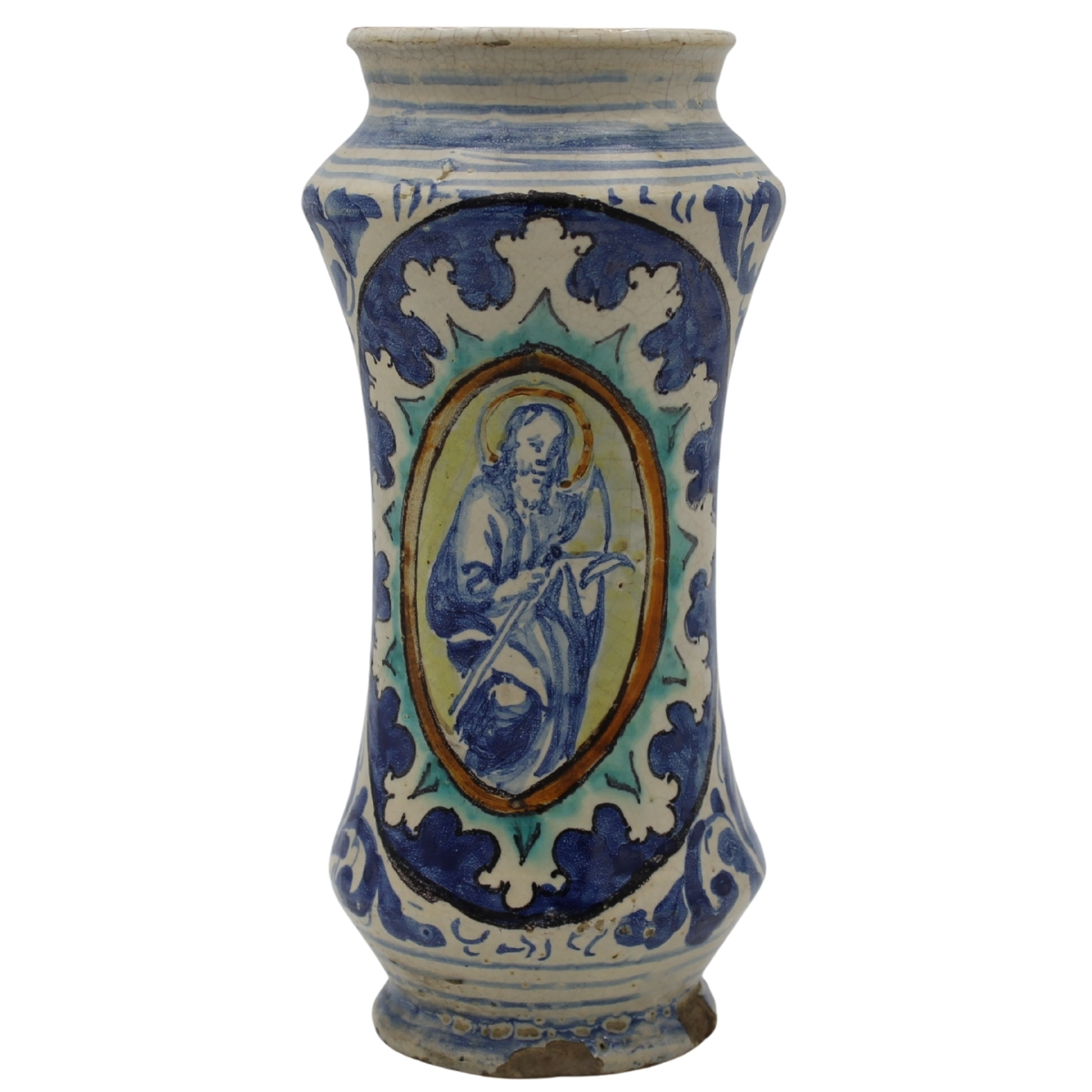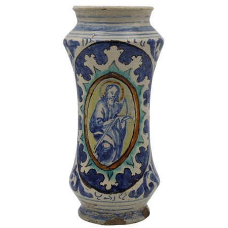 Albarello Antica maiolica con decoro frontale raffigurante medaglione centrale con figura sacra e sul retro motivi ornamentali e vegetali policromi. Trapani. Secolo XVII. Cm h 30