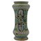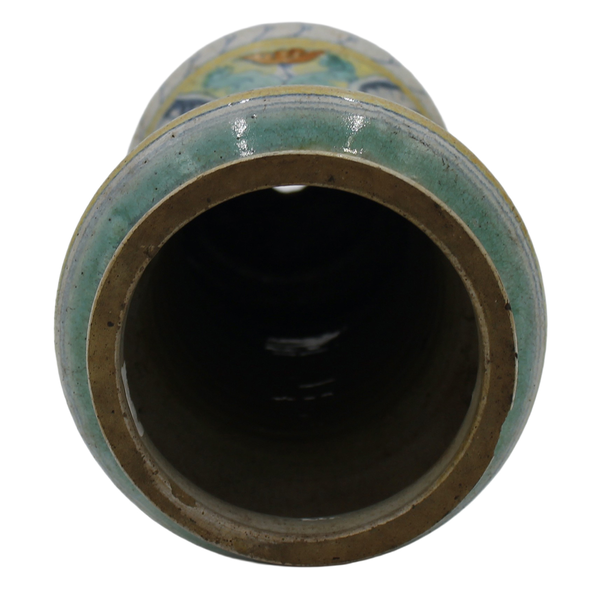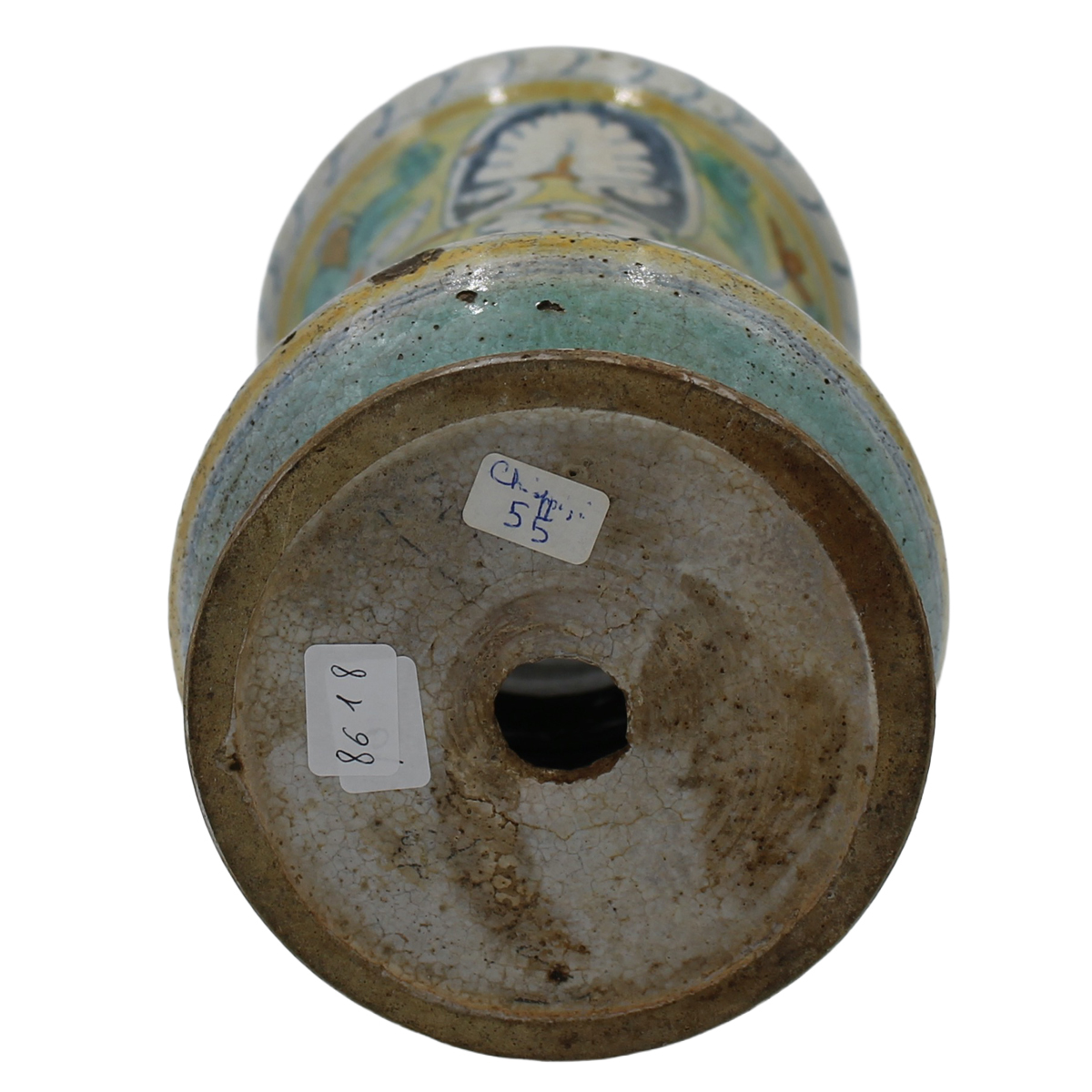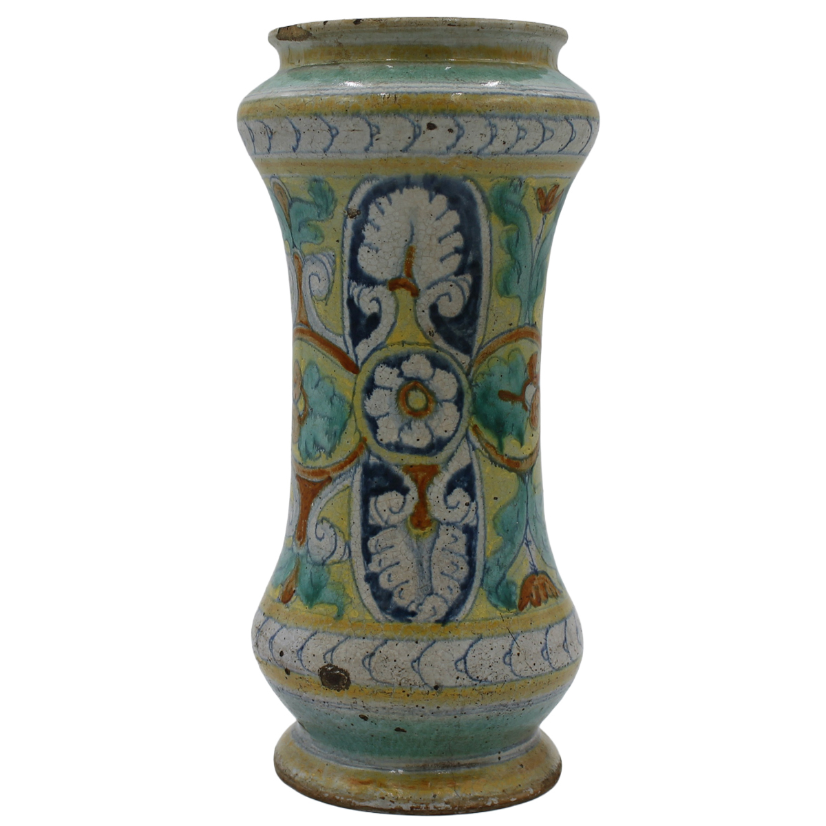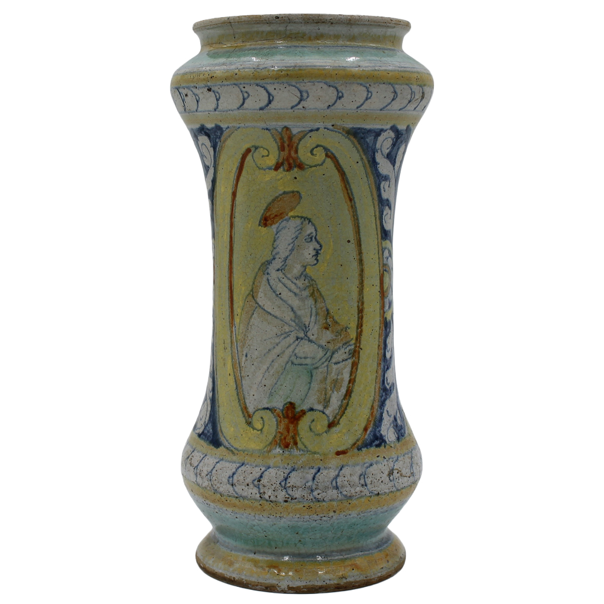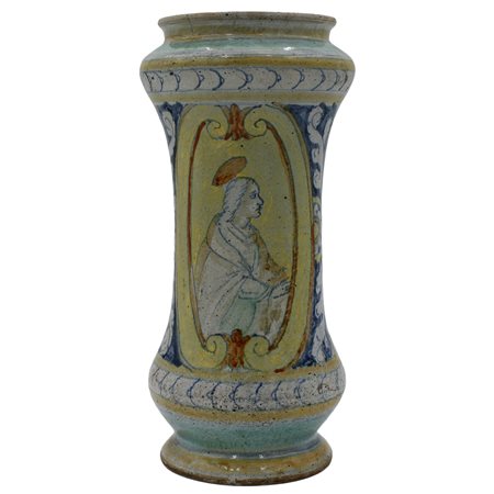 Albarello Antica maiolica con medaglione centrale raffigurante santa e sul retro motivi ornamentali, floreali e vegetali (foro sul fomndo). Sciacca. Inizi secolo XVIIIcm h 29