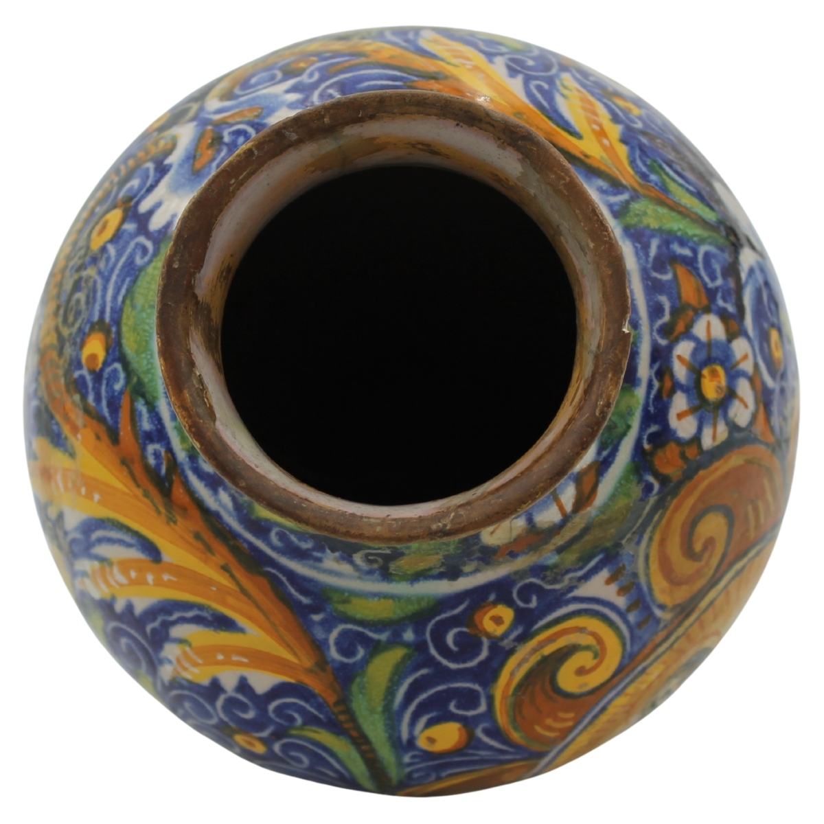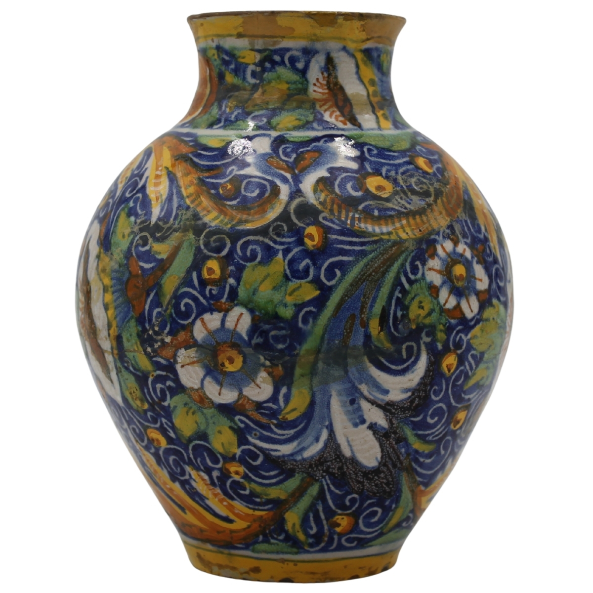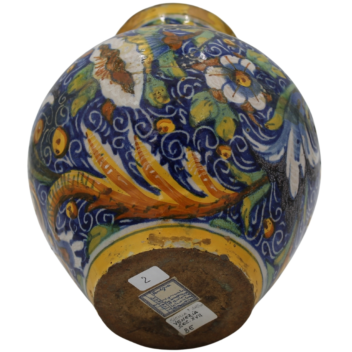 Vaso ovoidale Antica maiolica con medaglione centrale raffigurante la Maddalena e decoro a tutto tondo a motivi floreali e vegetali policromi (restauri al collo e rastauri nella parte centrale). Venezia. Secolo XVII. Cm h 24,5
