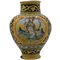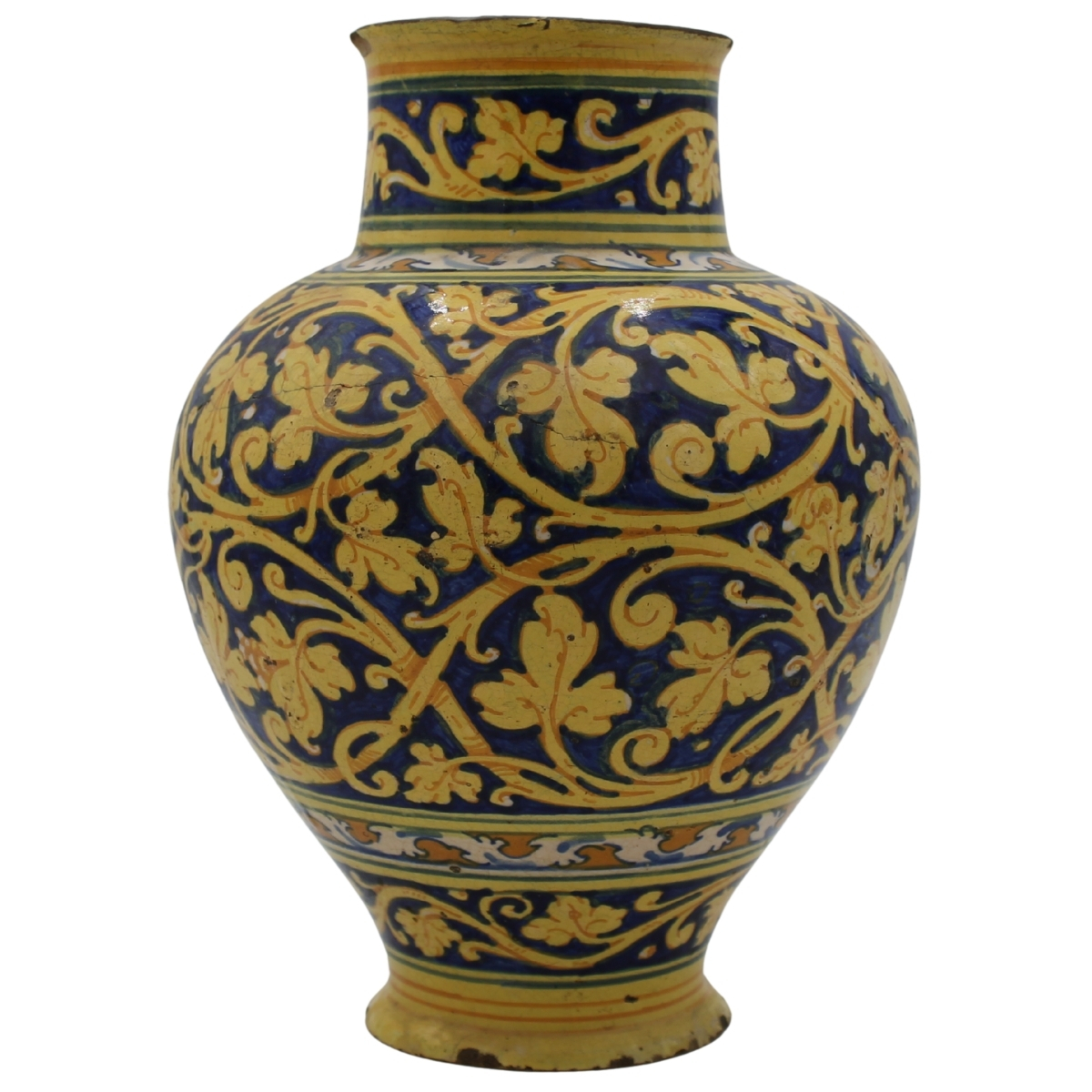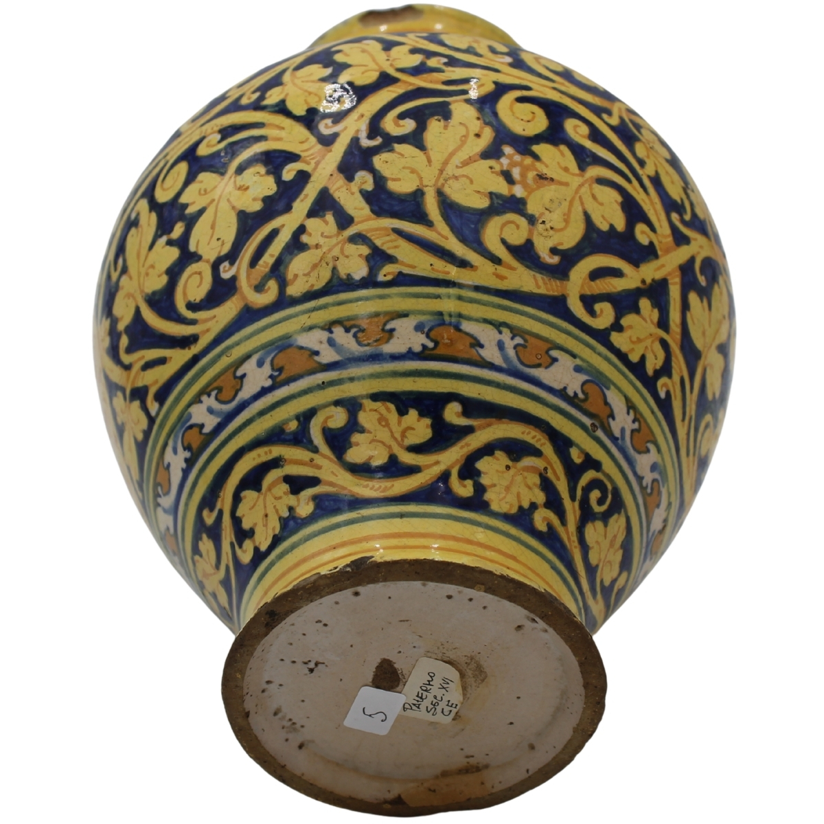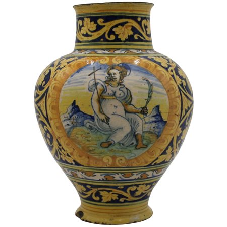 Vaso ovoidale Antica maiolica decorata sul davanti con medaglione centrale raffigurante figura di santa e sul retro decorazioni vegetali ed ornamentali policrome (lievi piccole failure). Palermo. Secolo XVII. Cm h 30