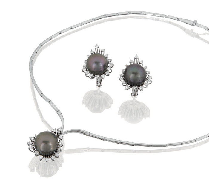 DEMI PARURE. In oro bianco 18 kt composta da coppia di orecchini perno e clip e da collana a maglie rettangolari con perle coltivate Tahiti di mm 14 ca. entro cornici in diamanti taglio brillante per tot. cts. 1,80 ca. su motivi realizzati in filo d'oro liscio.