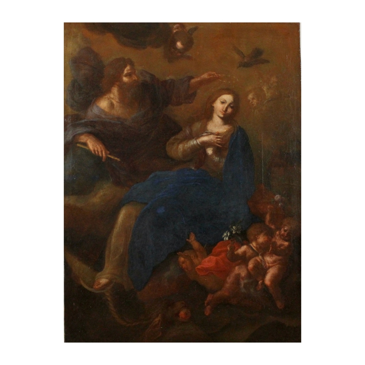 Scuola siciliana della fine del secolo XVII "Scena sacra" Grande dipinto ad olio su tel ain legno ebanizzato e dorato (restauri, rifodero e ritelaiatura). Cm 103x76