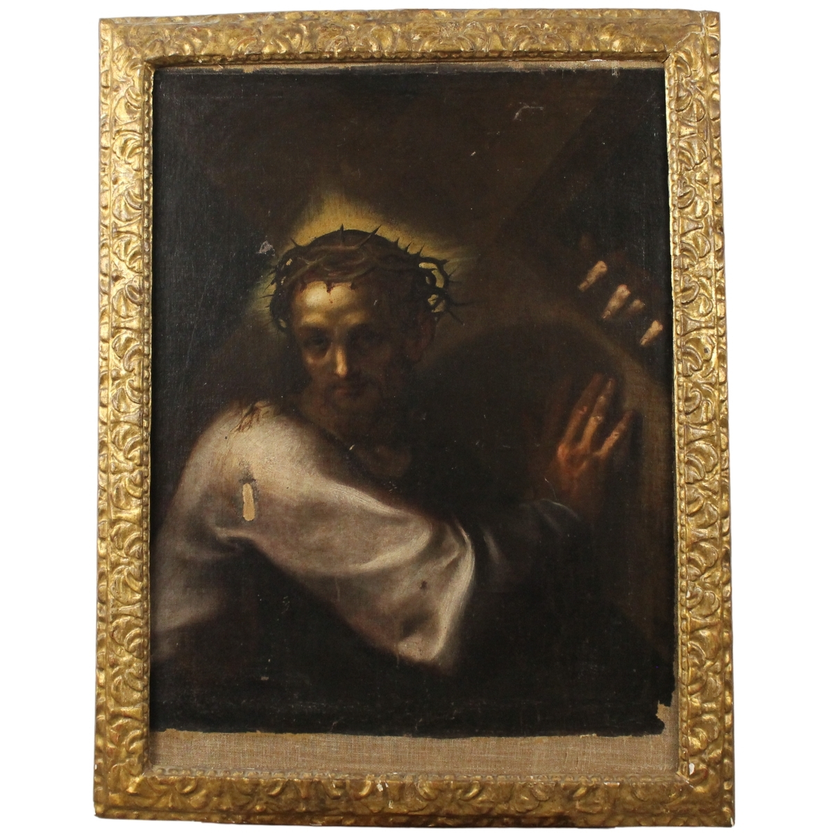 Scuola dell'Italia meridinale del secolo XVII "Cristo porta croce" Dipinto ad olio su tela in cornice in legno scolpito e dorato (restauri, rifodero e ritelaiatura). Cm 98x78