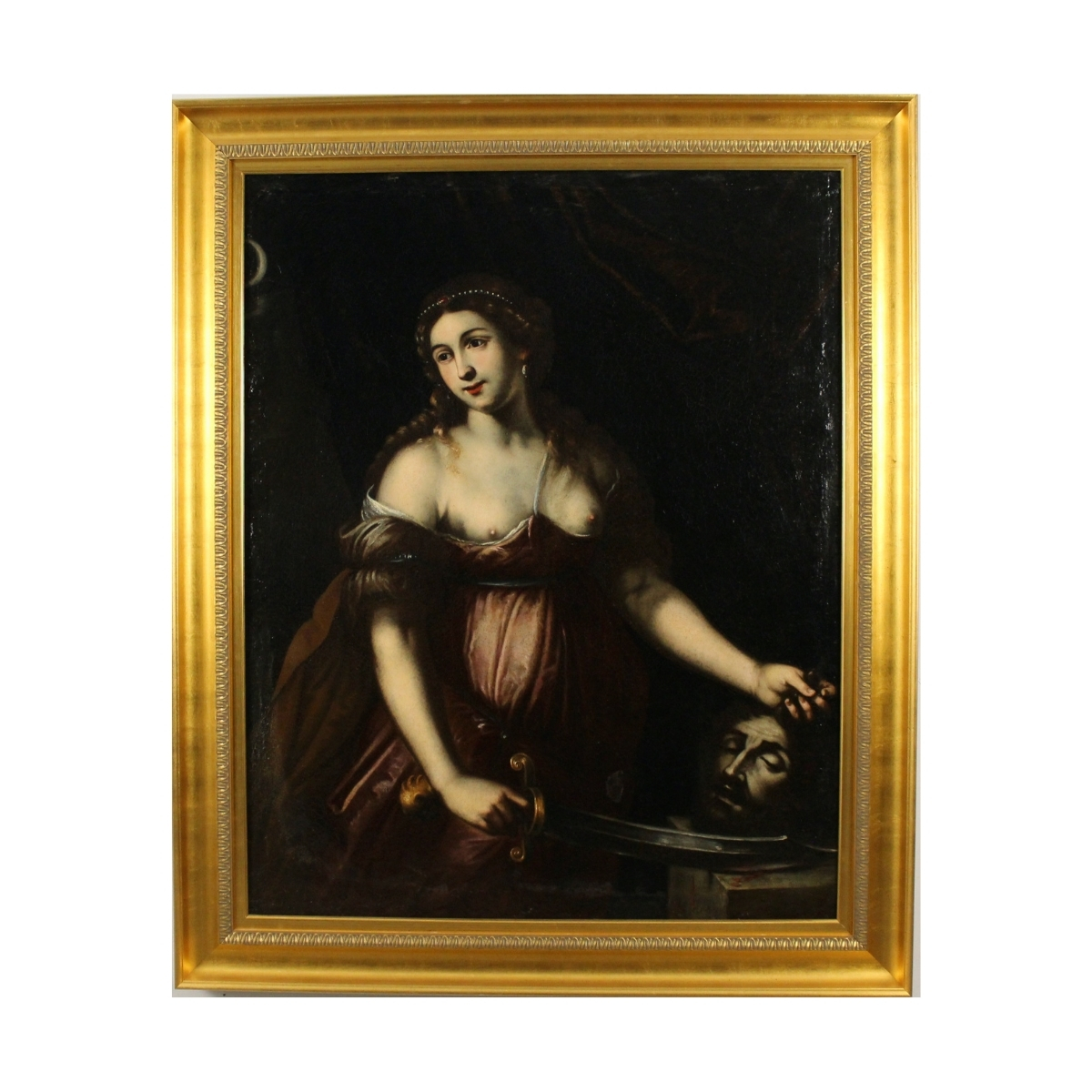 Scuola italiana del secolo XVII "Giuditta con la testa di Oloferne" Dipinto ad olio su tela in cornice in legno dorato di epoca posteriore (restauri e rifodero). Cm 128x102