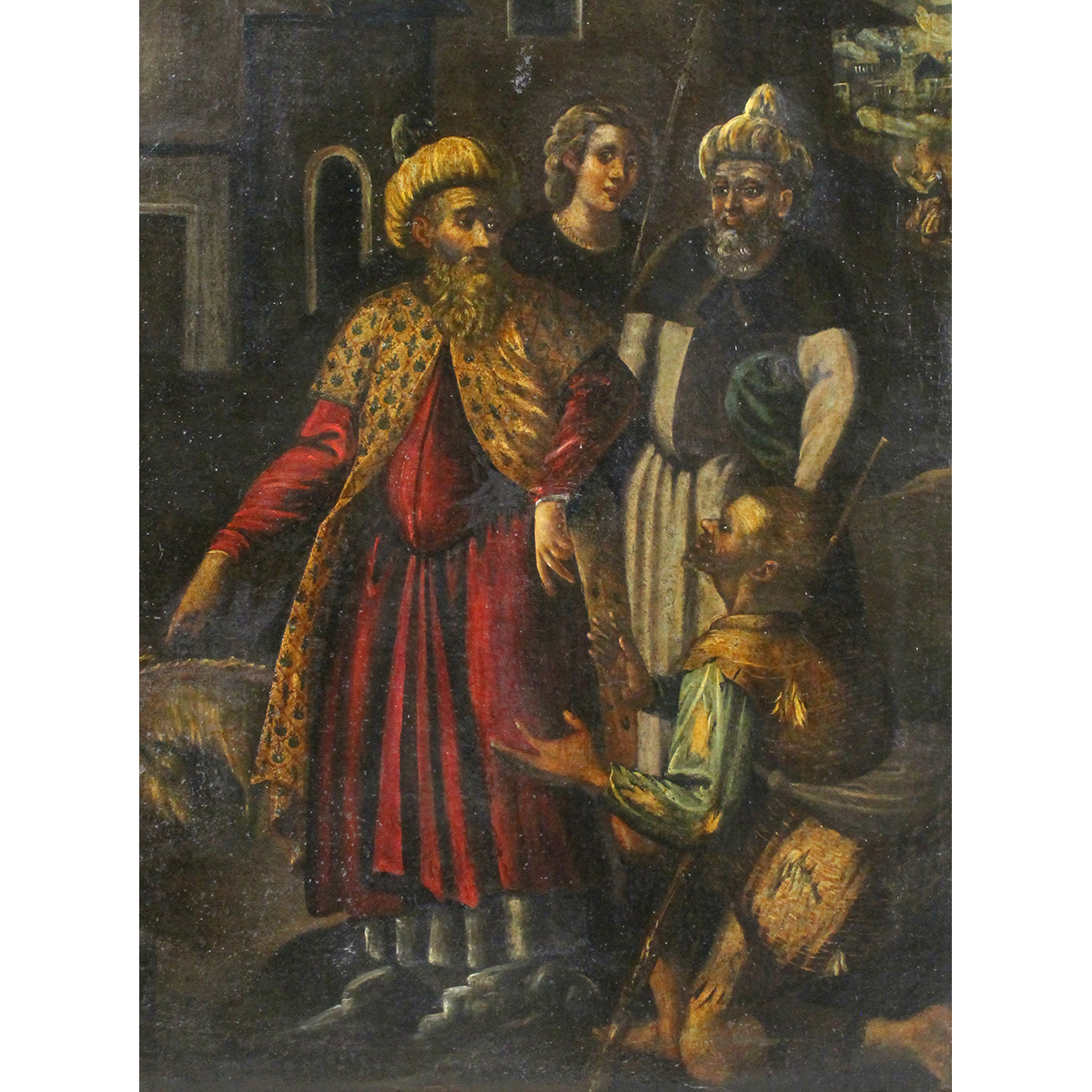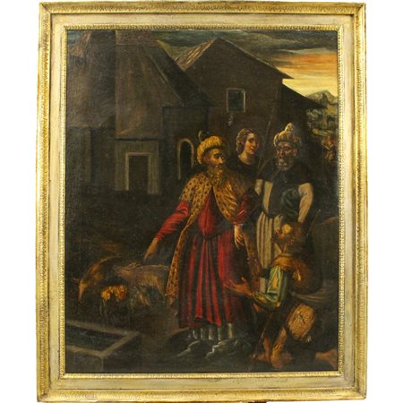 Scuola fiamminga del secolo XVIII "Scena di vita popolare" Dipinto ad olio su tela in cornice in legno dorato di epoca posteriore (restauri e vecchio rifodero). Cm 118x94