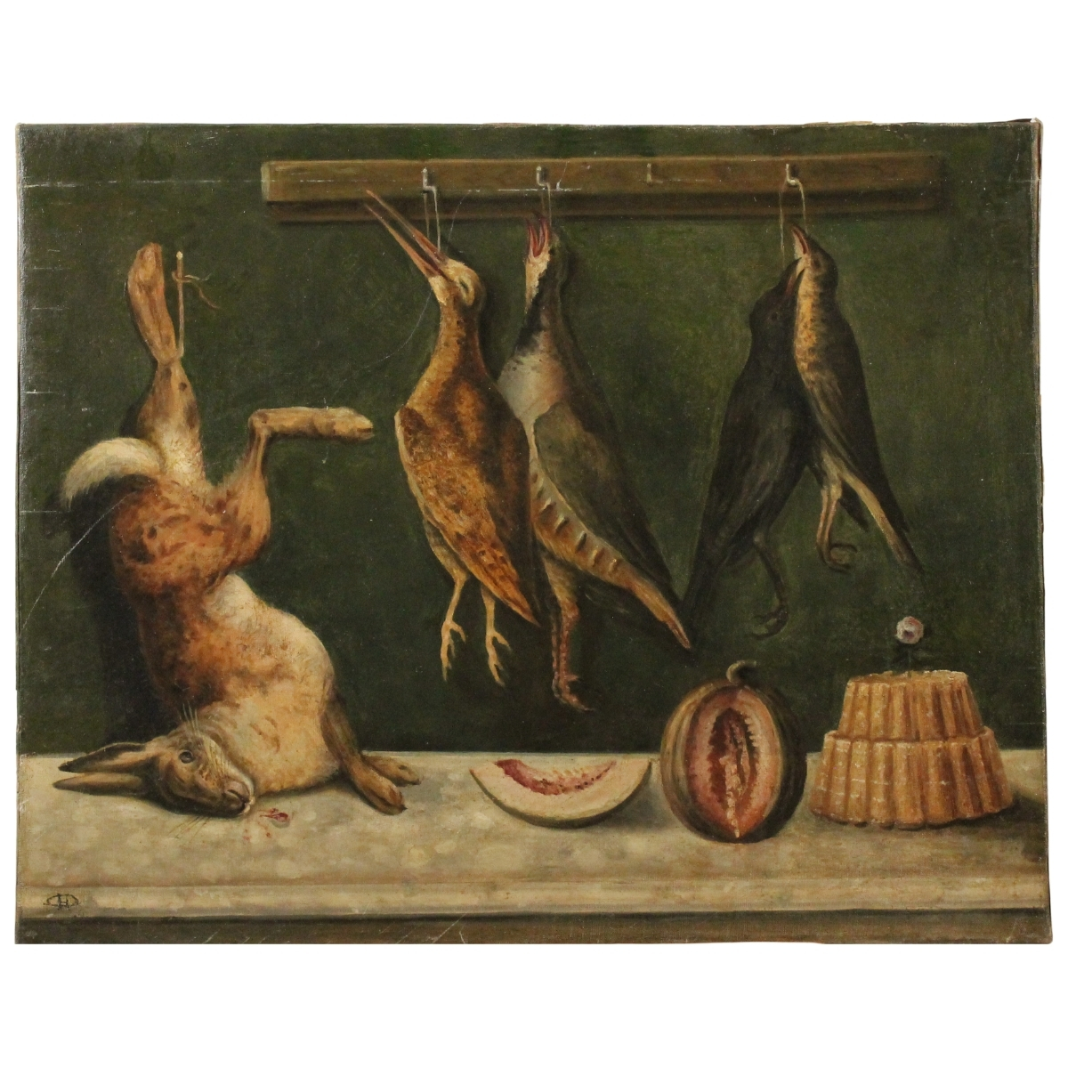 Scuola fiamminga del secolo XIX "Natura morta con cacciagione" Dipinto ad olio su tela. Monogramma in basso a sinistra (restauri e rifodero). Cm 65x81
