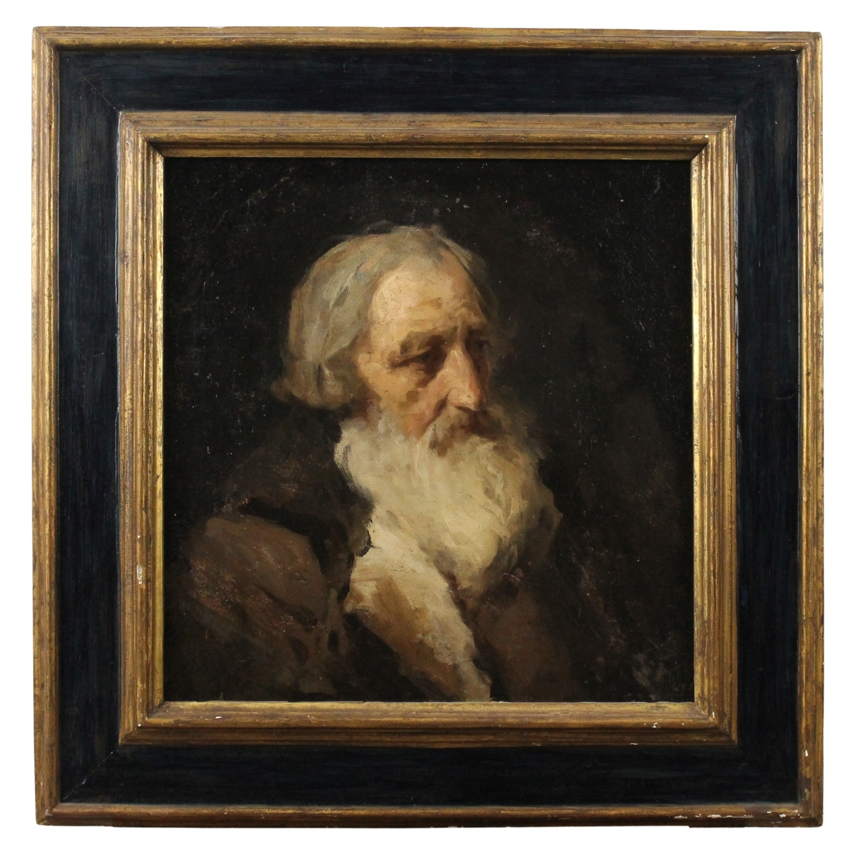 Scuola italiana del secolo XIX "Figura di uomo con barba" Olio su tela in cornice in legno dorato ed ebanizzato (piccoli rinforzi, rifodero e ritelaiatura). Cm 50x49