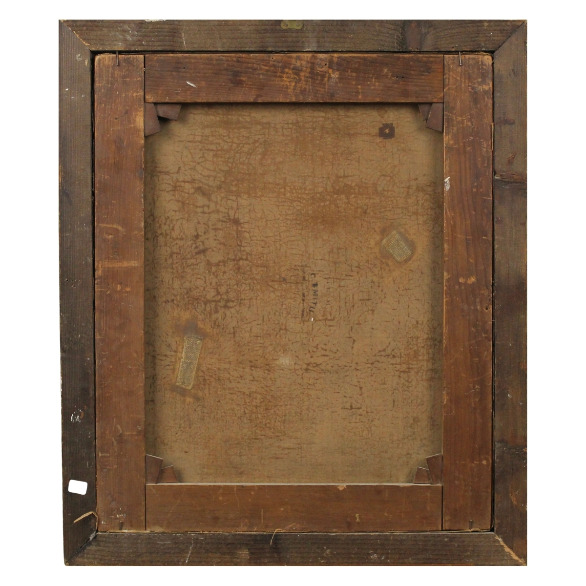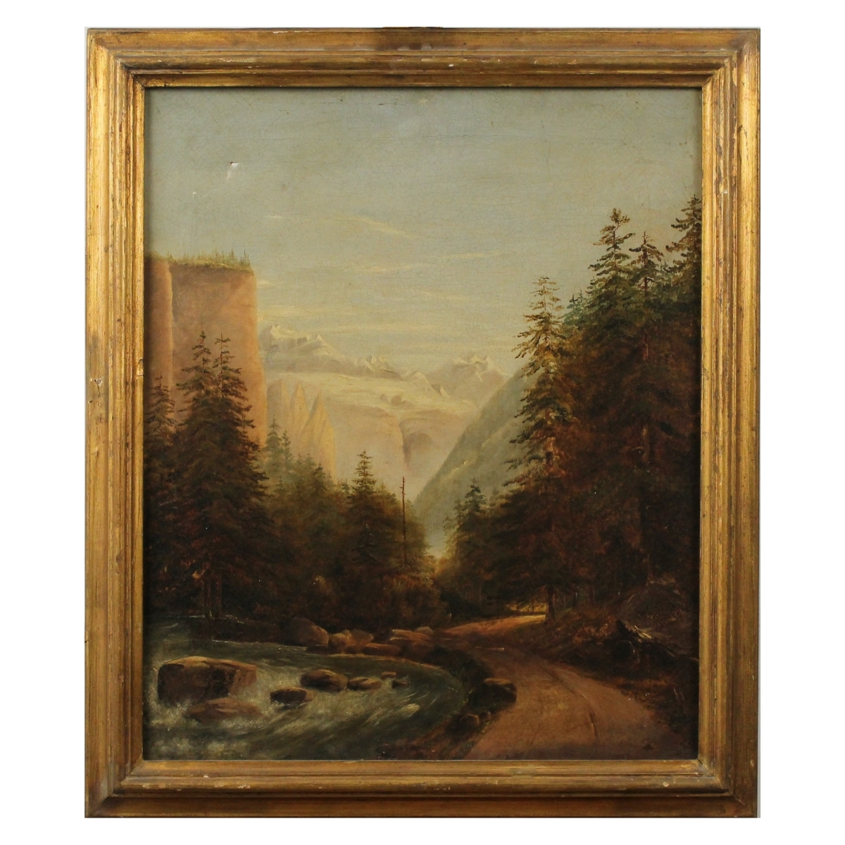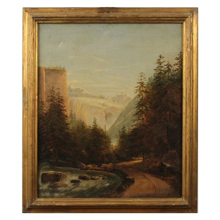 Scuola inglese della fine del secolo XIX "Ruscello nel bosco" Dipinto ad olio su tela in cornice in legno (danni e riparazioni alla tela). Cm 57x48
