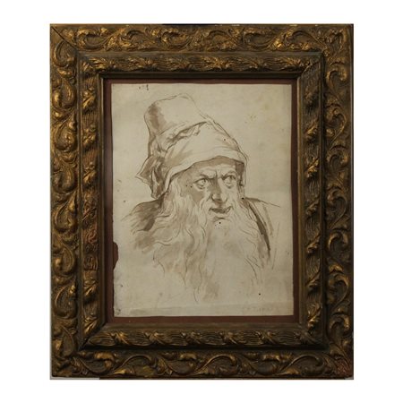 "Figura di uomo con barba e cappello" Disegno su carta in cornice in legno dorato. Cm 27x21