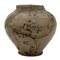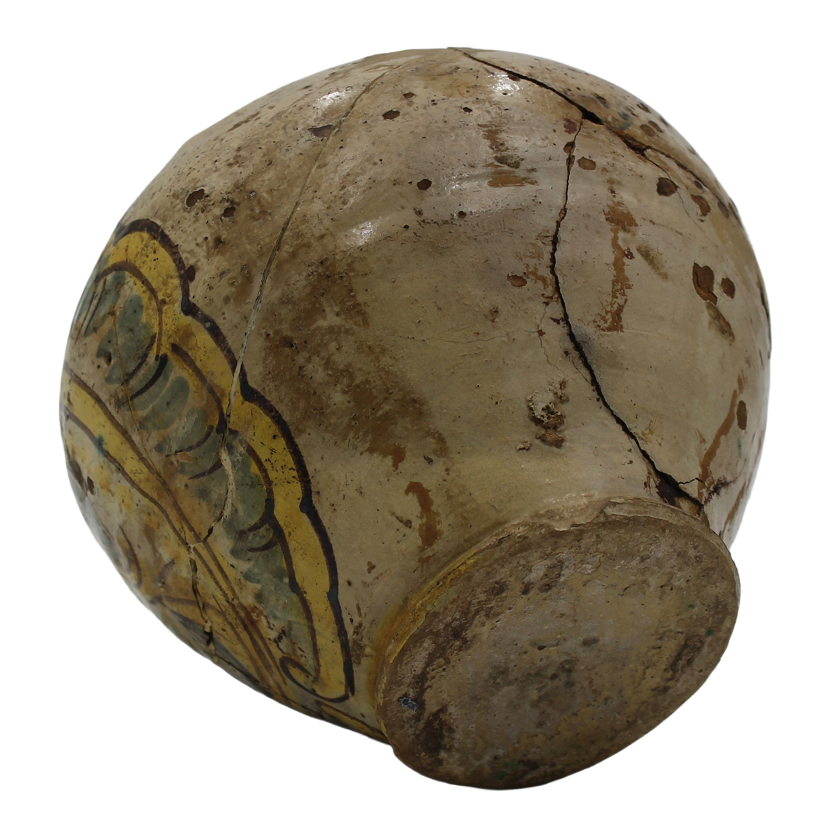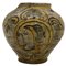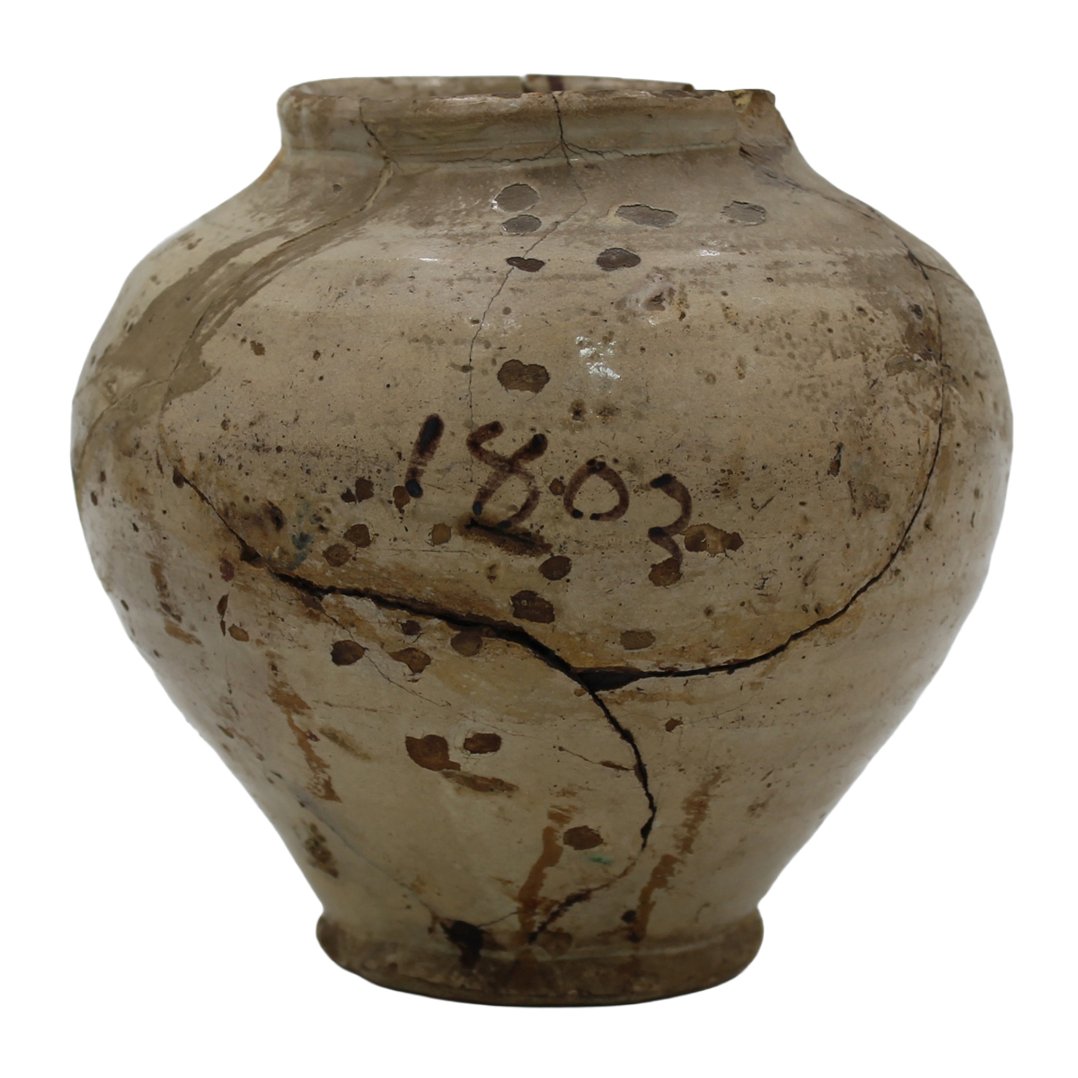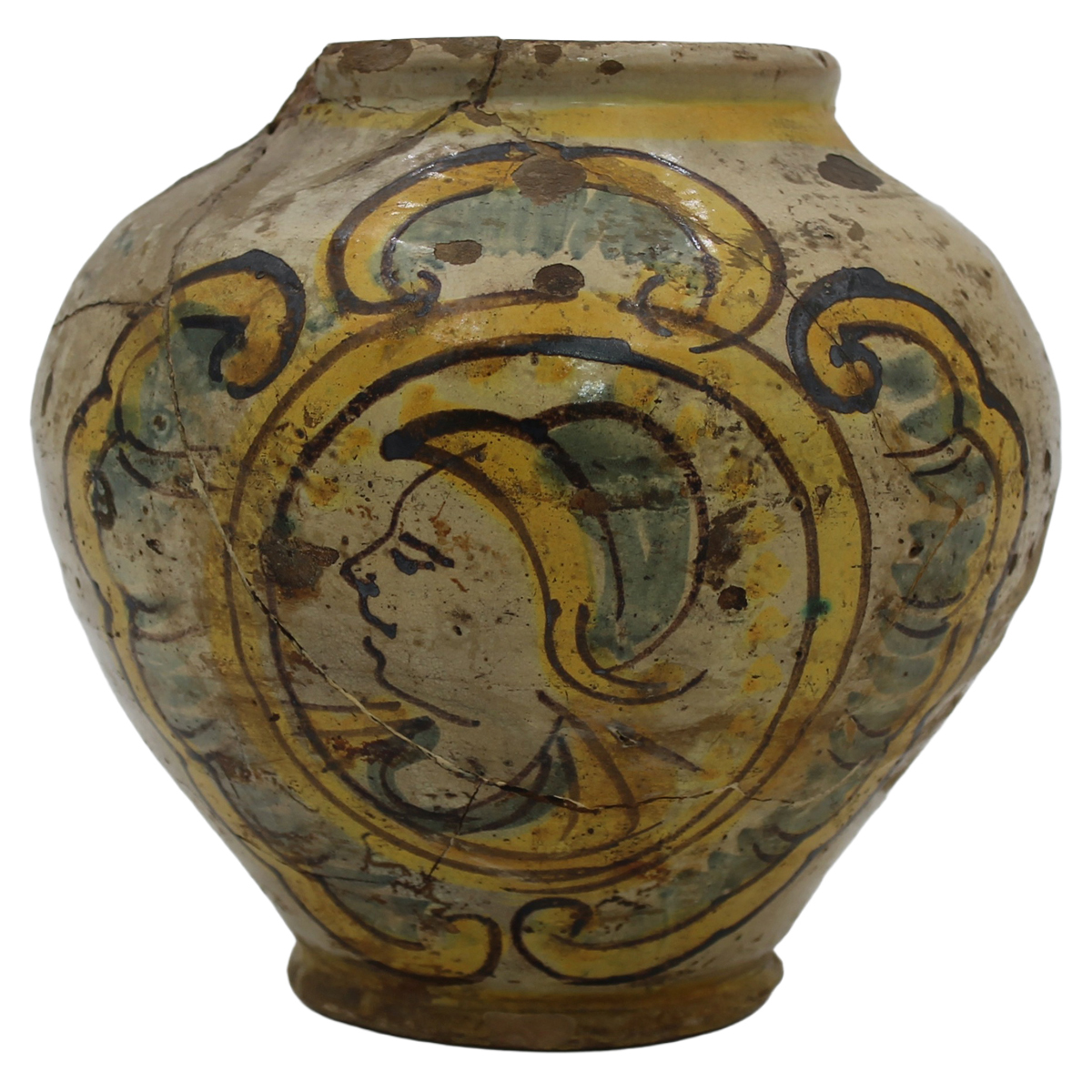 Piccola boccia Antica maiolica con decoro frontale con profilo di soldato a motivi ornamentali policromi su fondo crema (varie rotture e incollaggi). Caltagirone. Datata 1803. Cm h 18,5