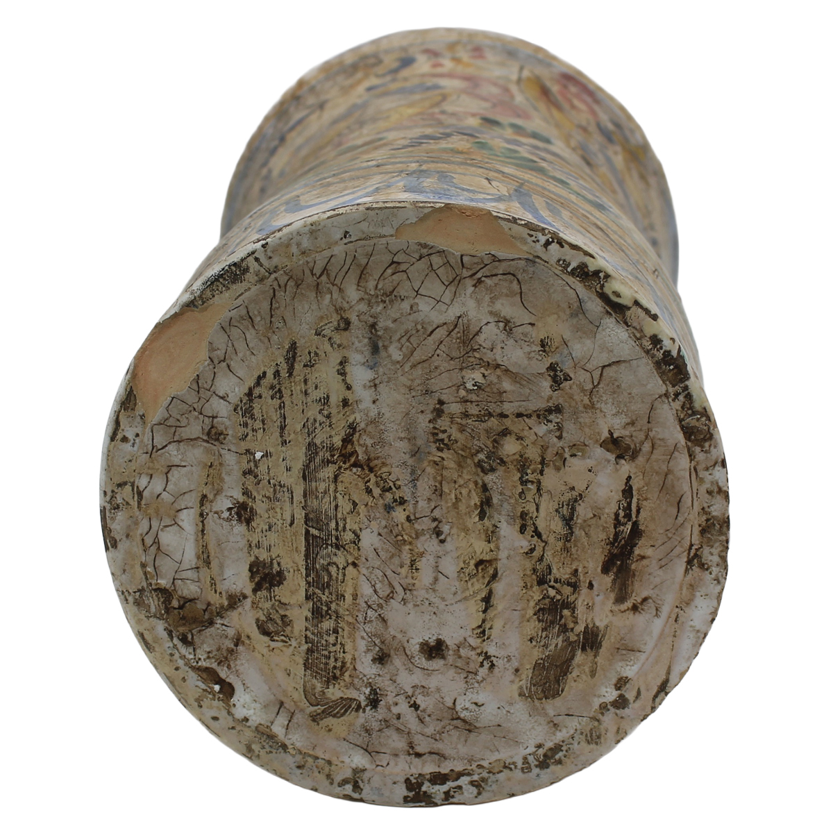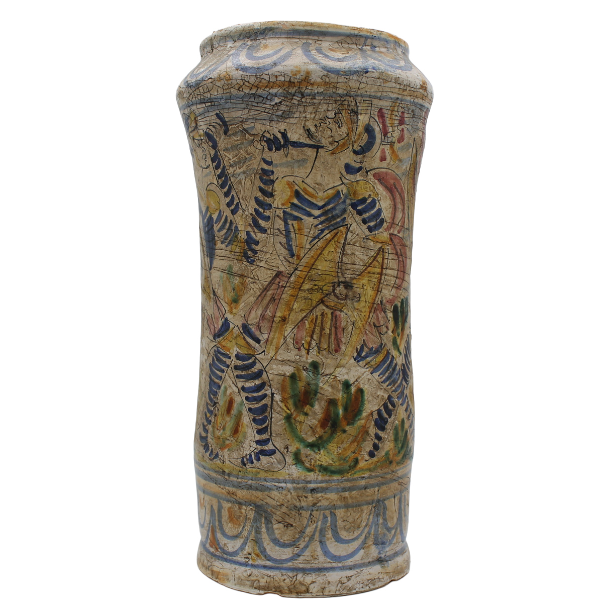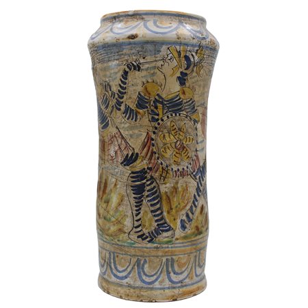 Grande vaso Maiolica policroma con decoro di soldati e motivi ornamentali policromi. Secolo XX. Cm h 54