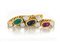 LOTTO DI TRE ANELLI DI POMELLATO. In oro bianco e giallo 18 kt, montatura a cordone ritorto con zaffiro, rubino, smeraldo taglio ovale cabochon per tot. cts. 1,50 ca. entro decori in diamanti taglio brillante per tot. cts. 0,60 ca.