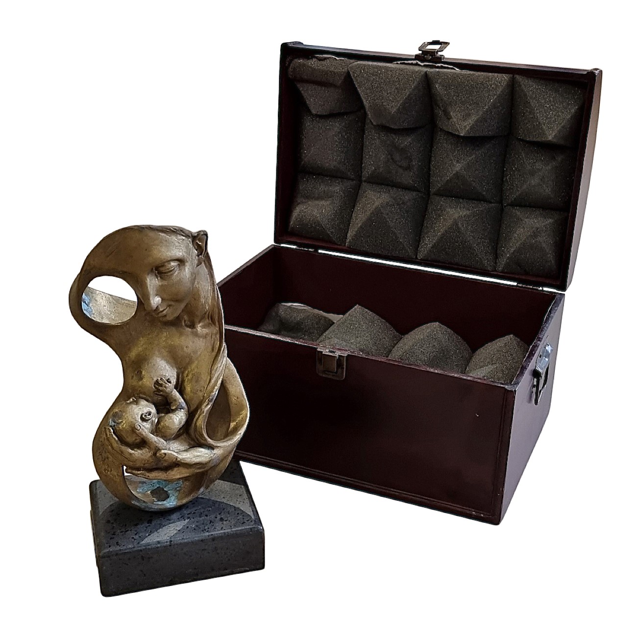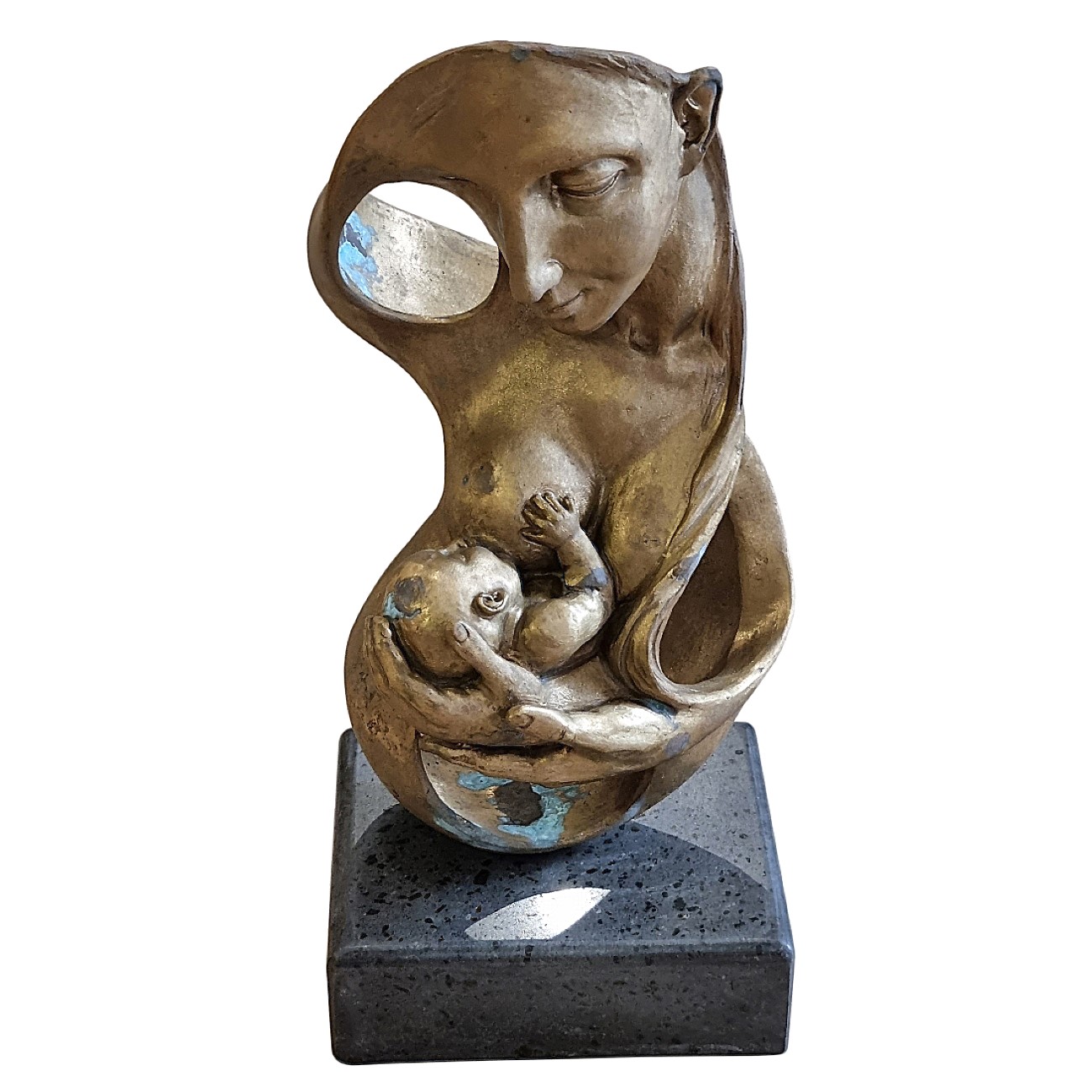 SORRENTINO DOMENICO Cava de' Tirreni 1966 "Infinito" Scultura in bronzo dorato cm 30x18x16 su base di marmo cm 12x16x5. Etichetta descrittiva sul lato sinistro, opera contenuta nel suo baule originario.