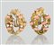 COPPIA DI ORECCHINI. In oro giallo 18 kt a clip con motivi a voluta e settori incisi a microcrateri impreziositi da diamanti taglio brillante per tot. cts. 0,80 ca. ed inserti in corallo rosa taglio ovale cabochon.