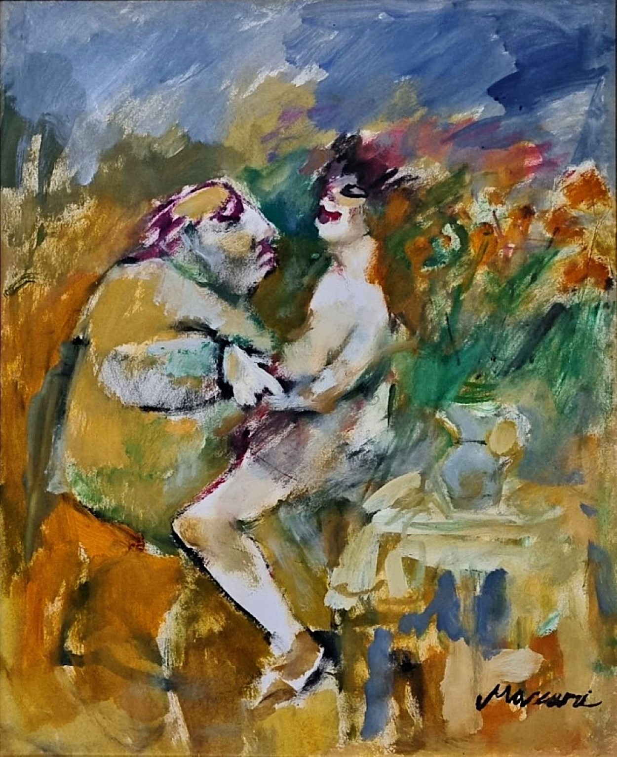 MACCARI MINO Siena 1898 - Roma 1989 "Corteggiamento" Olio su tavola cm 42x52. Firmato sul fronte in basso a destra. Al retro timbro della Galleria Guidi. Opera registrata presso l'Archivio delle opere del Maestro, come da dichiarazione su foto, di Marco Maccari. Certificato di garanzia ed autenticità di altra casa d'aste.