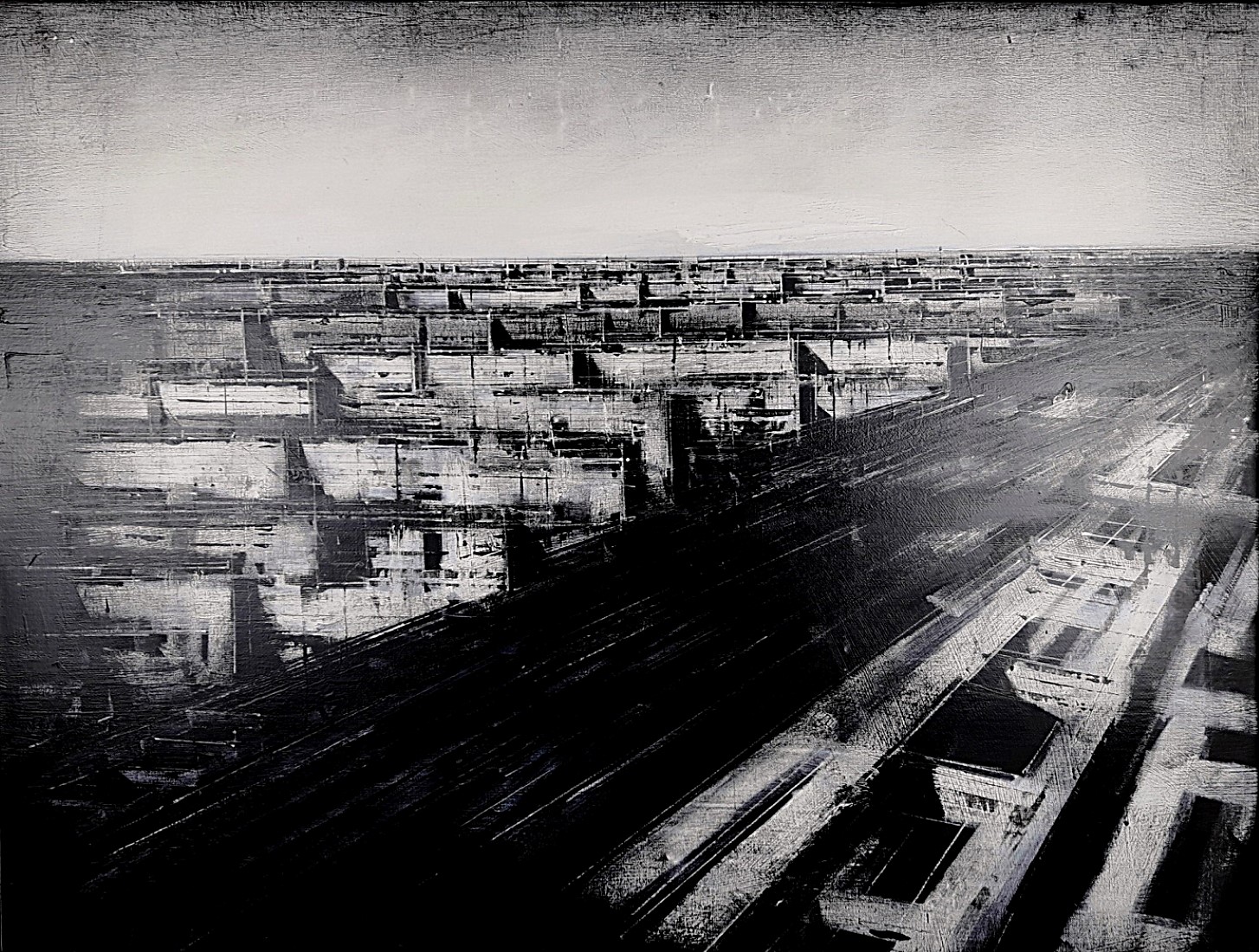 GUAITAMACCHI JONATHAN Londra 1961 "Ovest" Olio su carta intelata cm 80x60 del 2004. Al verso firma, titolo, data ed etichetta di provenienza della Galleria Real Arte di Sant'Elpidio. Autentica su foto.