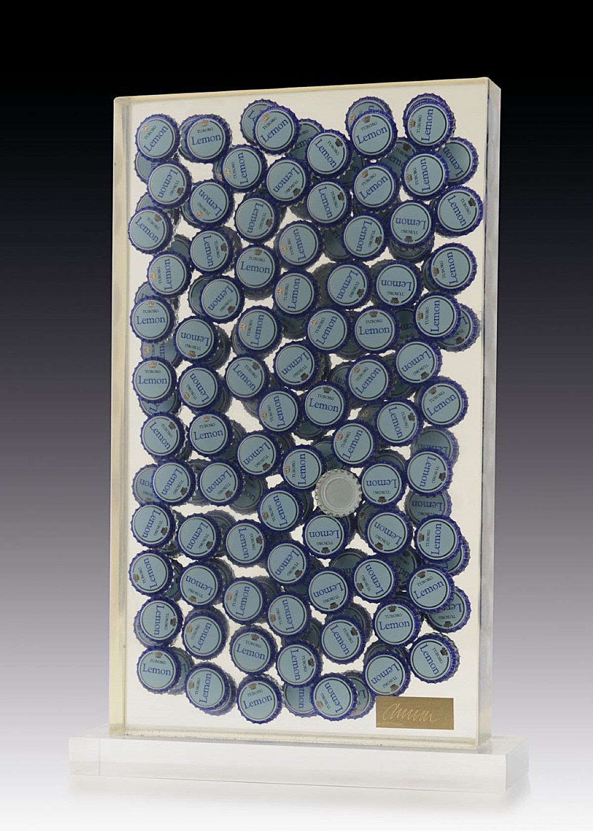 FERNANDEZ ARMAN Nizza 1928 - New York 2005 "Tuborg Lemon" Accumulazione di tappi contenuti in resina poliestere, cm 25x42x5 (su base in plexiglass cm 2,5x29x9), del 1996. Esemplare 30/30, firma su targa in basso a destra e tiratura sul retro. Archivio su foto a cura di Archives Denyse Durand-Ruel.