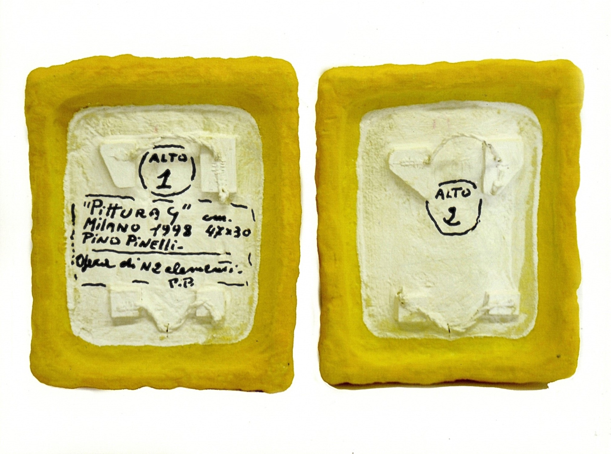 PINELLI PINO Catania 1938 - 2024 "Pittura G" Tecnica mista su due elementi cm 47x30 applicati su tavola cm 75x60, del 1998. Firma, titolo, data, luogo e misure al verso. Autentica su doppia foto a cura del Maestro.