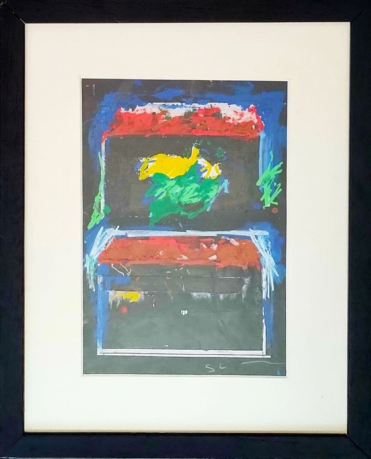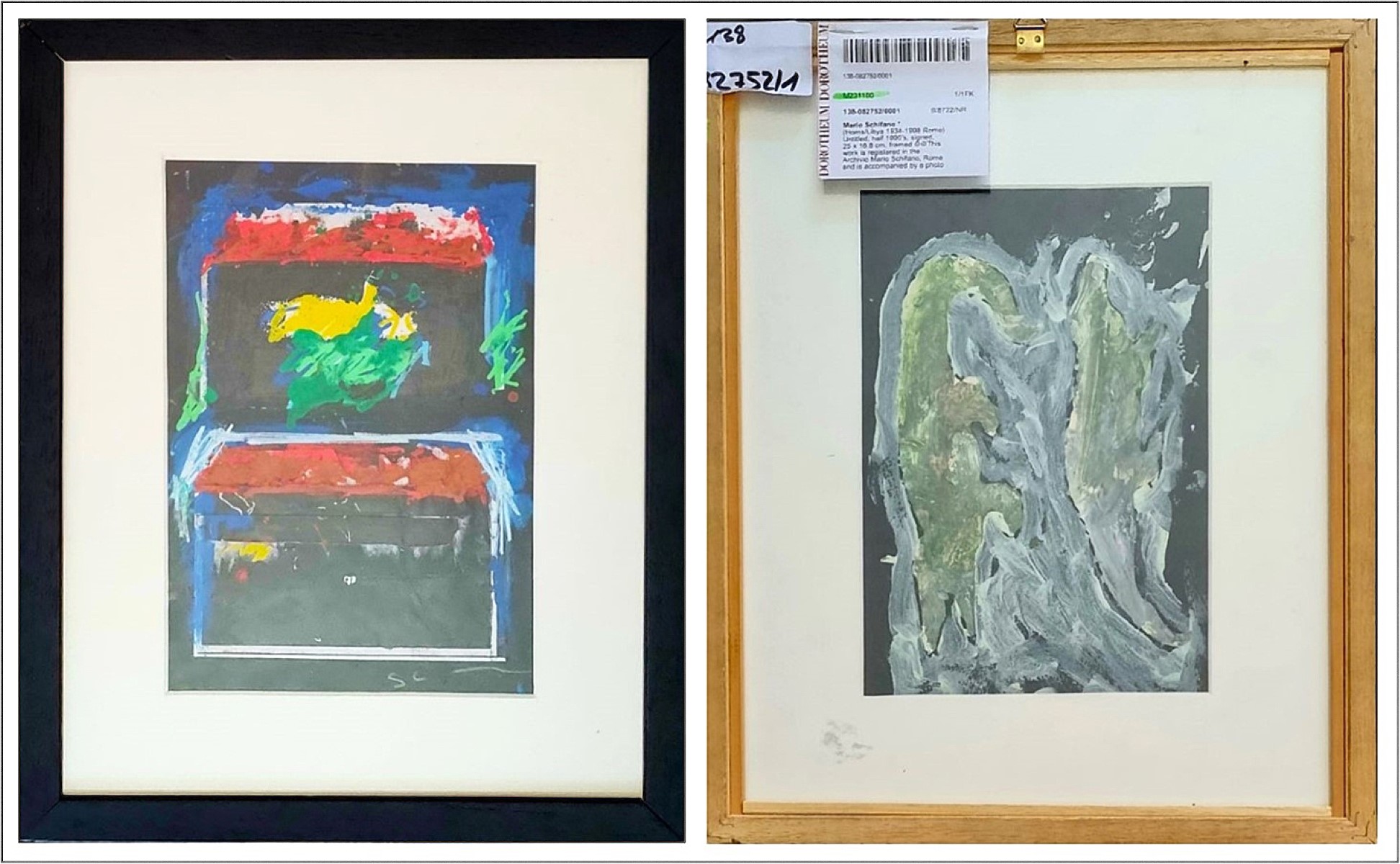 SCHIFANO MARIO Libia 1934 - Roma 1998 "Senza titolo" Acrilico, pennarelli e collage su cartoncino cm 17x25 (dipinto fronte/retro) della prima metà degli anni '90. Firmato sul fronte in basso a destra. Certificato di autenticità ed archiviazione a cura di Monica Schifano.