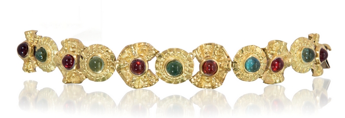 BRACCIALE. In oro giallo 18 kt a settori circolari in lamina stampata centrati da gemme multicolor taglio rotondo cabochon (prob. tormaline).