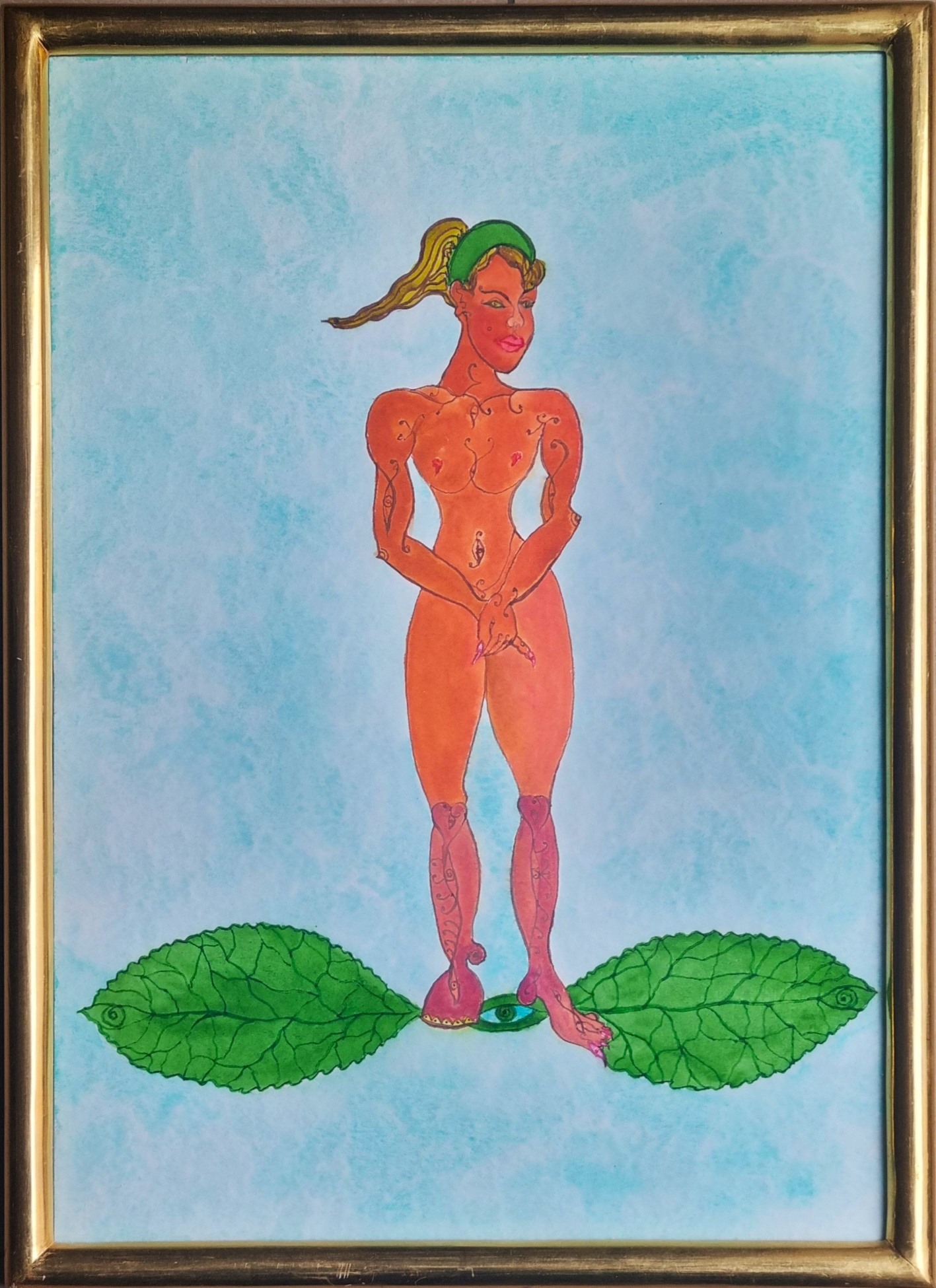 ONTANI LUIGI Vergato 1943 "Figlio e foglia" Acquerello su carta cm 53x38 del 1996-2013, in cornice dorata. Al verso intitolato, firmato, datato e situato. Autentica su foto a cura del Maestro. Cornice originale applicata dall'Artista.