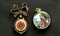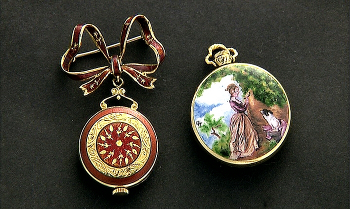 Casse in oro giallo 18 kt, una con smalto rosso e spilla a fiocco in oro e smalto "en suite" ed una con miniatura al retro e larga lunetta in smalto color avorio con fiori. Quadranti incisi con numeri romani smaltati. Movimenti a carica manuale.