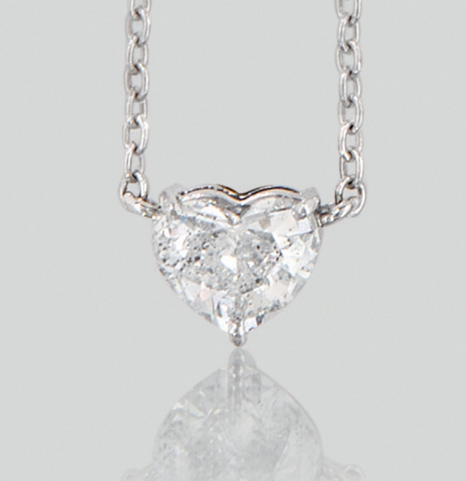 CIONDOLO. In oro bianco 18 kt centrato da diamante taglio cuore di cts. 1,00 ca. (prob. colore F purezza P) entro castone a tre griffes, trattenuto da fine catenina in oro bianco 18 kt.
