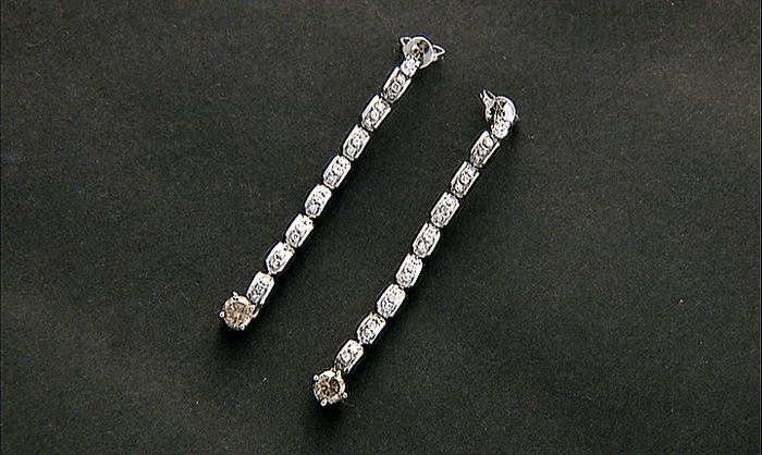 COPPIA DI ORECCHINI PENDENTI. In oro bianco 18 kt perno e farfalla con settori ovalizzati verticali in diamanti taglio brillante per tot. cts. 0,50 ca. e due diamanti brown taglio brillante per tot. cts. 0,80 ca. incastonati nella parte terminale.