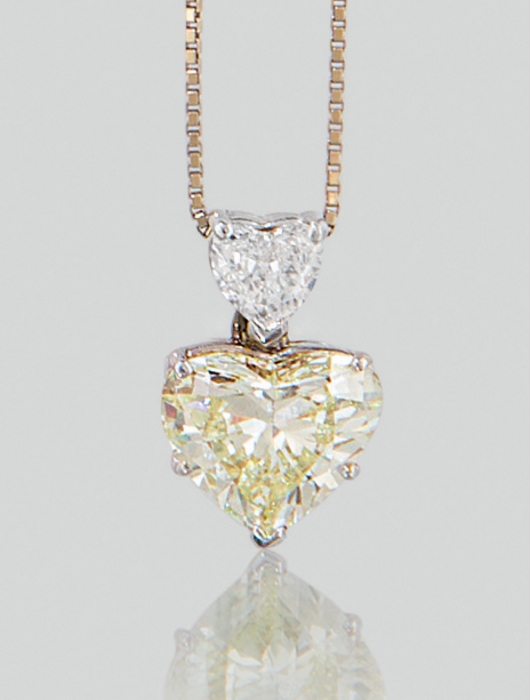 CIONDOLO. In oro bianco 18 kt centrato da due diamanti taglio cuore, uno paglierino di cts. 1,70 ca. (prob. purezza VS) ed uno di cts. 0,30 ca. (prob. colore H purezza VS), trattenuto da fine catenina in oro bianco 18 kt.
