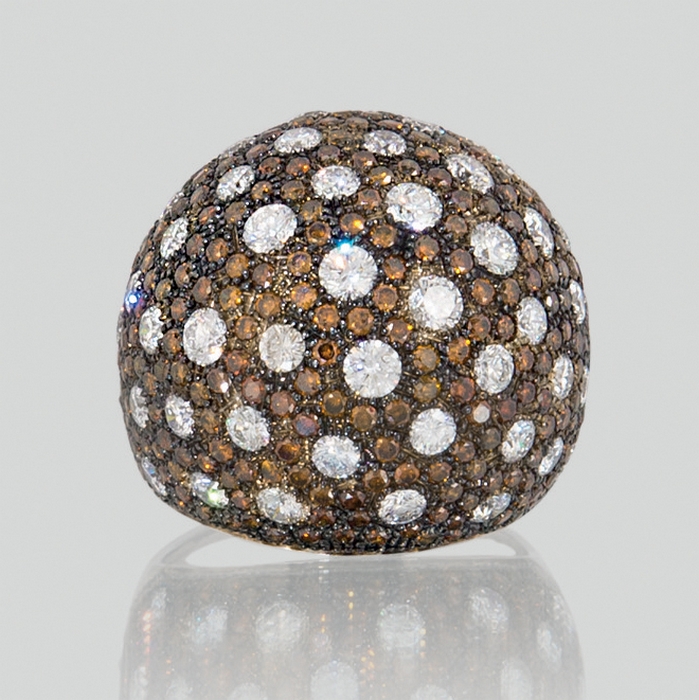 ANELLO. In oro bianco e brunito 18 kt, internamente foderato, montatura bombata impreziosita da diamanti taglio brillante incolore e fancy cognac per tot. cts. 5,10 ca.
