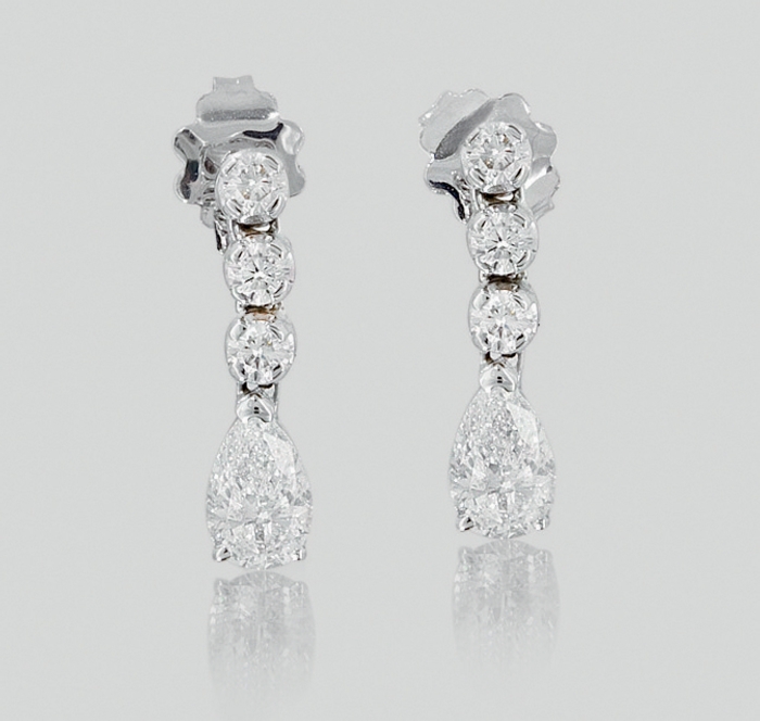 COPPIA DI ORECCHINI. In oro bianco 18 kt perno e farfalla con settori verticali incernierati in diamanti taglio brillante per tot. cts. 0,60 ca. e diamanti taglio goccia per tot. cts. 1,40 ca. nella parte terminale.