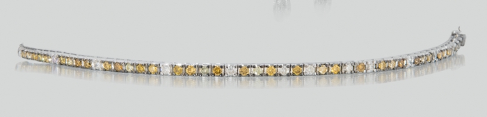 BRACCIALE TENNIS. In oro bianco e brunito 18 kt interamente percorso da diamanti taglio brillante incolore e fancy yellow per tot. cts. 3,40 ca. entro castoni a quattro griffes.