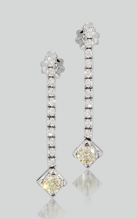 COPPIA DI ORECCHINI PENDENTI. In oro bianco 18 kt perno e farfalla con settori verticali in diamanti taglio brillante per tot. cts. 1,00 ca. e due diamanti light yellow fancy taglio brillante di cts. 0,50 (purezza VVS1) e 0,51 (purezza VS2), allegati certificati gemmologici n. 228817/16 del 14/03/2008 Centro Analisi Gemmologiche, Dott. Pio Visconti, Valenza.