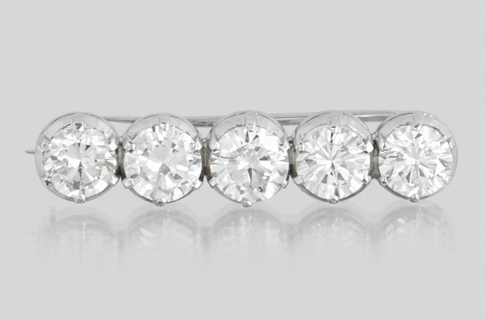 SPILLA. In oro bianco 18 kt con cinque diamanti taglio brillante per tot. cts. 4,80 ca. (prob. colore J/L purezza VS/VVS) entro castoni tondi a sei griffes, chiusura a doppio ago.