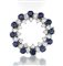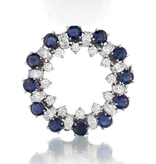 SPILLA ANNI '60 CA. In oro bianco 18 kt di forma circolare con decori in zaffiri taglio rotondo per tot. cts. 3,00 ca. alternati a diamanti taglio brillante e navette per tot. cts. 1,60 ca., chiusura ad ago semplice.