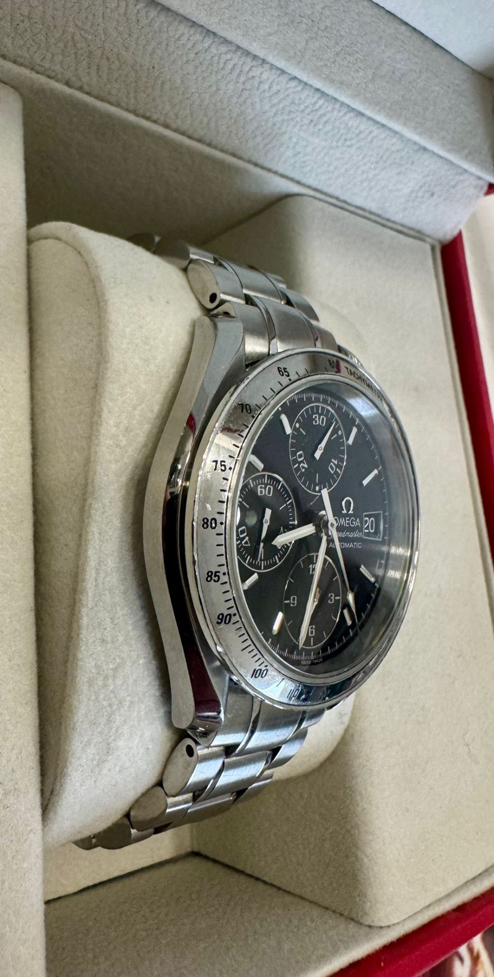 Marca Omega Modello (Orologio) Speedmaster Date Numero di referenza 3513.5000 Carica Automatico Materiale della cassa Acciaio Materiale cinturino Acciaio Anno di produzione 2022 Condizione Usato (Buono) L'articolo presenta segni di usura percepibili alla vista e al tatto, come graffi, scalfitture o piccole ammaccature , documenti originali Carica Automatico Cassa Materiale della cassa Acciaio Diametro 39 x 13.5 mm Impermeabile 5 ATM Materiale lunetta Acciaio Vetro Vetro zaffiro Quadrante Nero Numeri sul quadrante Senza numeri Cinturino Materiale cinturino Acciaio Colore cinturino Acciaio Chiusura Déployante Materiale chiusura Acciaio Funzioni Cronografo, Data - COMMISSIONE D’ASTA 25%