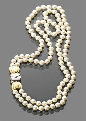COLLANA DI PERLE Collana con due fili di perle giapponesi di diam. mm 7,00-7,50 con fermaglio in oro bianco e giallo 28 strand japanese pearl necklace with 7,00 - 7,50 mm pearls and yellow and white gold clasp.