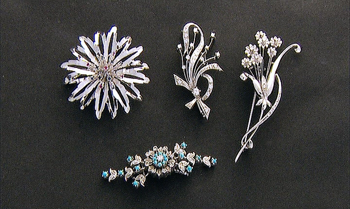 Lotto 357 | SPILLA LOTTO DI QUATTRO SPILLE ANNI '60 CA. In oro bianco 18 kt di gusto...
